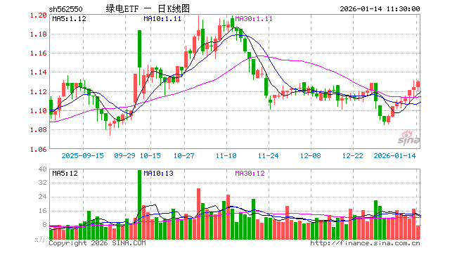 1月14日,截止午间收盘,绿电ETF(562550)涨0.53%,报1.130元,成交额843.03万元。绿电ETF(562550)重仓股方面,中国核电截止午盘涨0.22%,长江电力涨0.26%,三峡能源涨0.24%,国电电力跌0.20%,国投电力涨0.07%,华能国际涨0.13%,上海电力涨0.84%,川投能源涨0.00%,华电国际涨0.20%,浙能电力涨0.40%。