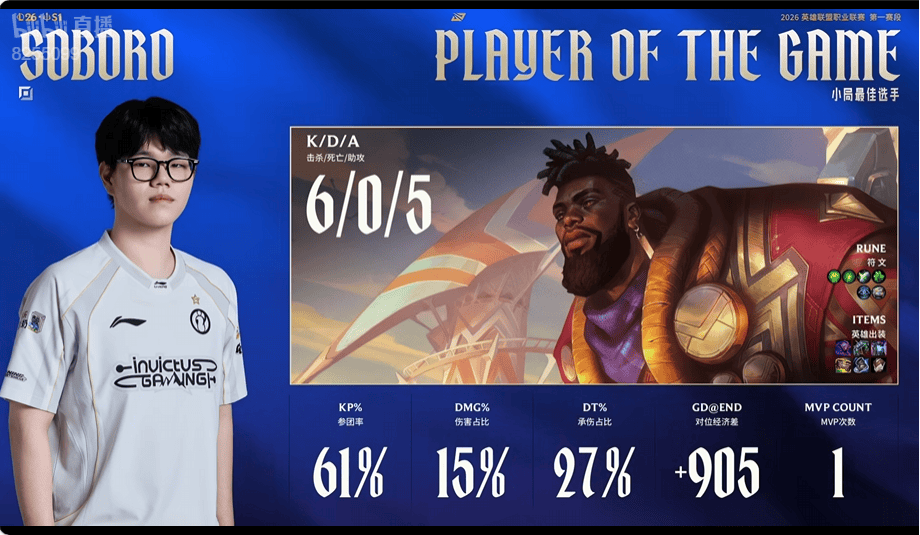 Soboro奎桑提打出6/0/5战绩,拿下IG对阵WBG首局MVP