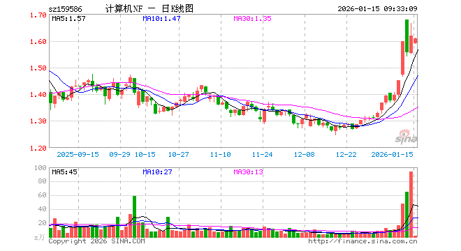 1月15日,计算机ETF南方(159586)开盘跌1.73%,报1.589元。计算机ETF南方(159586)重仓股方面,科大讯飞开盘跌1.56%,同花顺跌2.14%,金山办公跌1.54%,指南针跌0.70%,恒生电子跌2.36%,润和软件涨1.69%,三六零涨2.87%,拓维信息涨4.82%,用友网络跌2.10%。