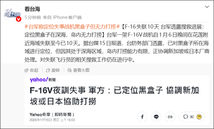 据台媒1月15日报道,台防务部门透露,已对黑盒子所在海域进行定位,但因其处于深海区域,岛内打捞能力有限,正协调新加坡或日本厂商处理。对失联飞行员的相关搜救工作仍在进行中。