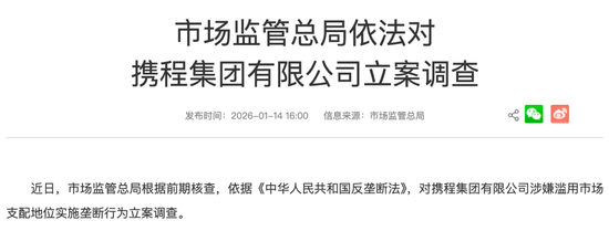 国家市场监管总局1月14日下午发布消息称,根据前期核查,依据《中华人民共和国反垄断法》,对携程涉嫌滥用市场支配地位实施垄断行为立案调查。