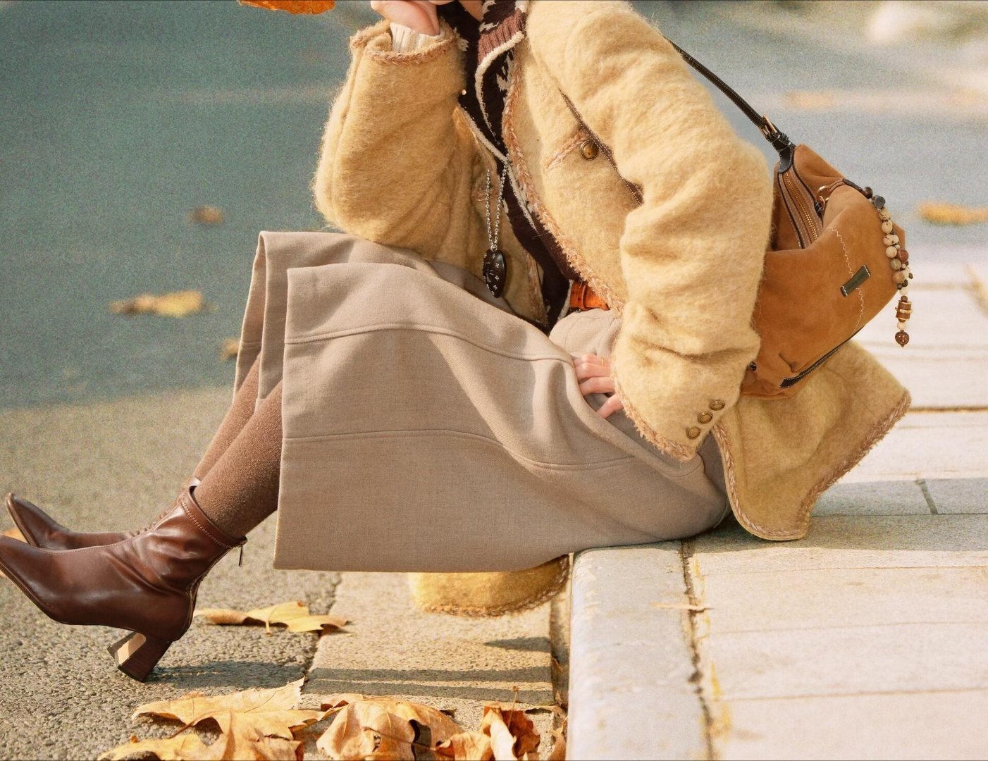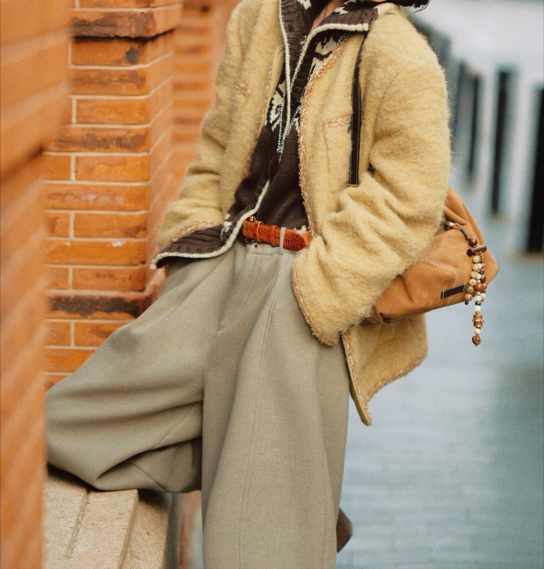 低温天懒人穿搭公式时尚灵感解读 冷天松弛感穿搭范本,浅棕毛绒外套搭费尔岛提花毛衣,叠穿层次感拉满,浅灰阔腿裤+复古棕靴慵懒随性,再用爱心项链和麂皮挎包点缀细节,整套穿搭温暖又治愈,完美适配冬日氛围。