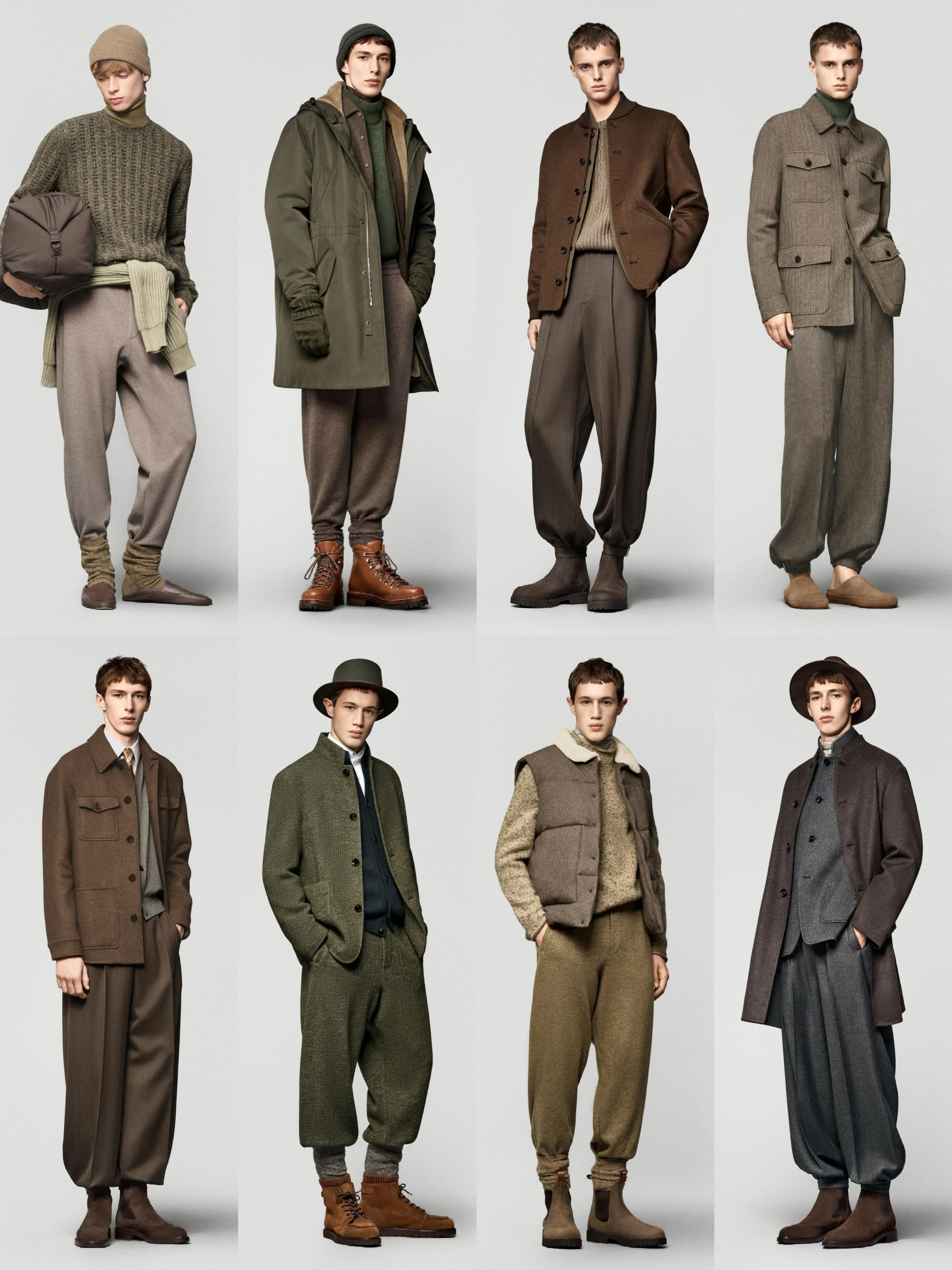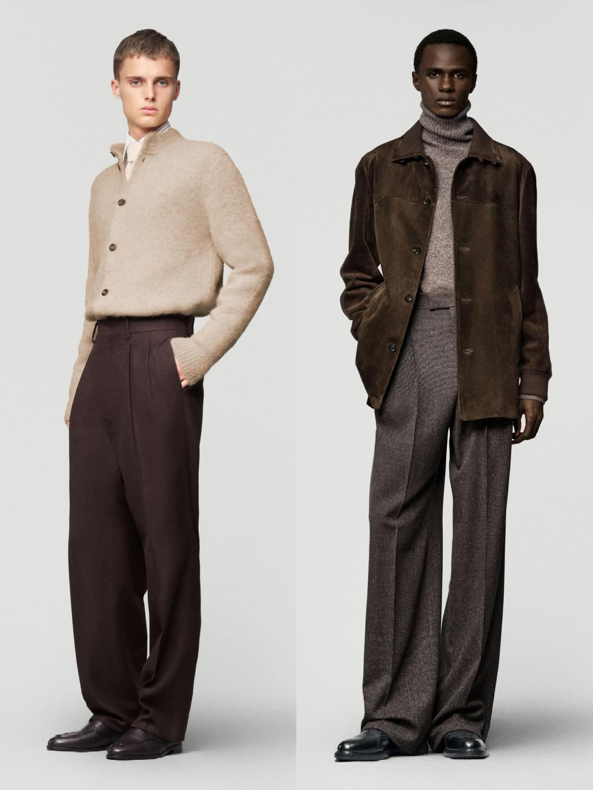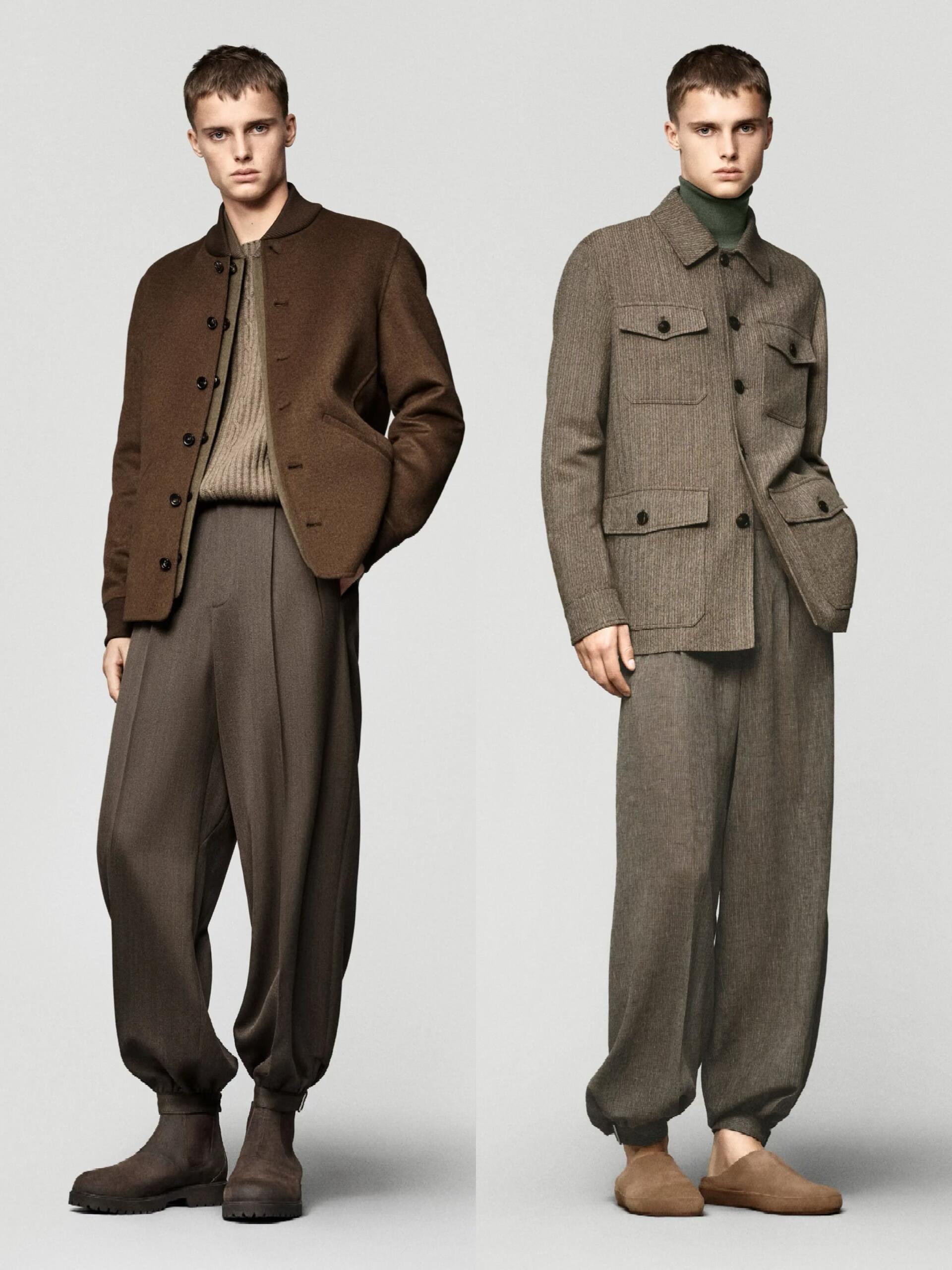 低温天懒人穿搭公式时尚灵感解读 低温天最温暖人心的还是老钱风穿搭。想拿捏秋冬男装的“老钱风”,核心在于“放松版型 + 顺色叠穿 + 精致配饰 + 硬朗田野细节”,跟着Loro Piana 20 秋冬男装系列学就对了。放松舒适的版型是基础,夹克、大衣、针织衫等单品都拒绝夸张收腰或紧身设计,优先保证穿着的松弛感与舒适度。标志性的高腰阔腿裤+裤脚收束设计,灵感源自南美放牧民族服饰,既给腿部留足活动空间、保证行动敏捷,又兼具保暖性,完美适配老钱们在牧场骑马打猎的假日场景。沉稳考究的顺色叠穿是精髓,整体以橄榄绿、烟草灰、深棕等大地色系为主,搭配黑白灰与米色,色调沉稳内敛,像《继承之战》里的富豪家族穿搭一样,不追求前卫夸张。穿搭以素色为主,杜绝logo老花堆叠,顺色叠穿的手法更是炉火纯青:高领衫+户外夹克、衬衫+V领衫+西装夹克、高领毛衣+长袖开衫+马甲,既能满足室内外不同场景的穿脱需求,又在低调中尽显品味。