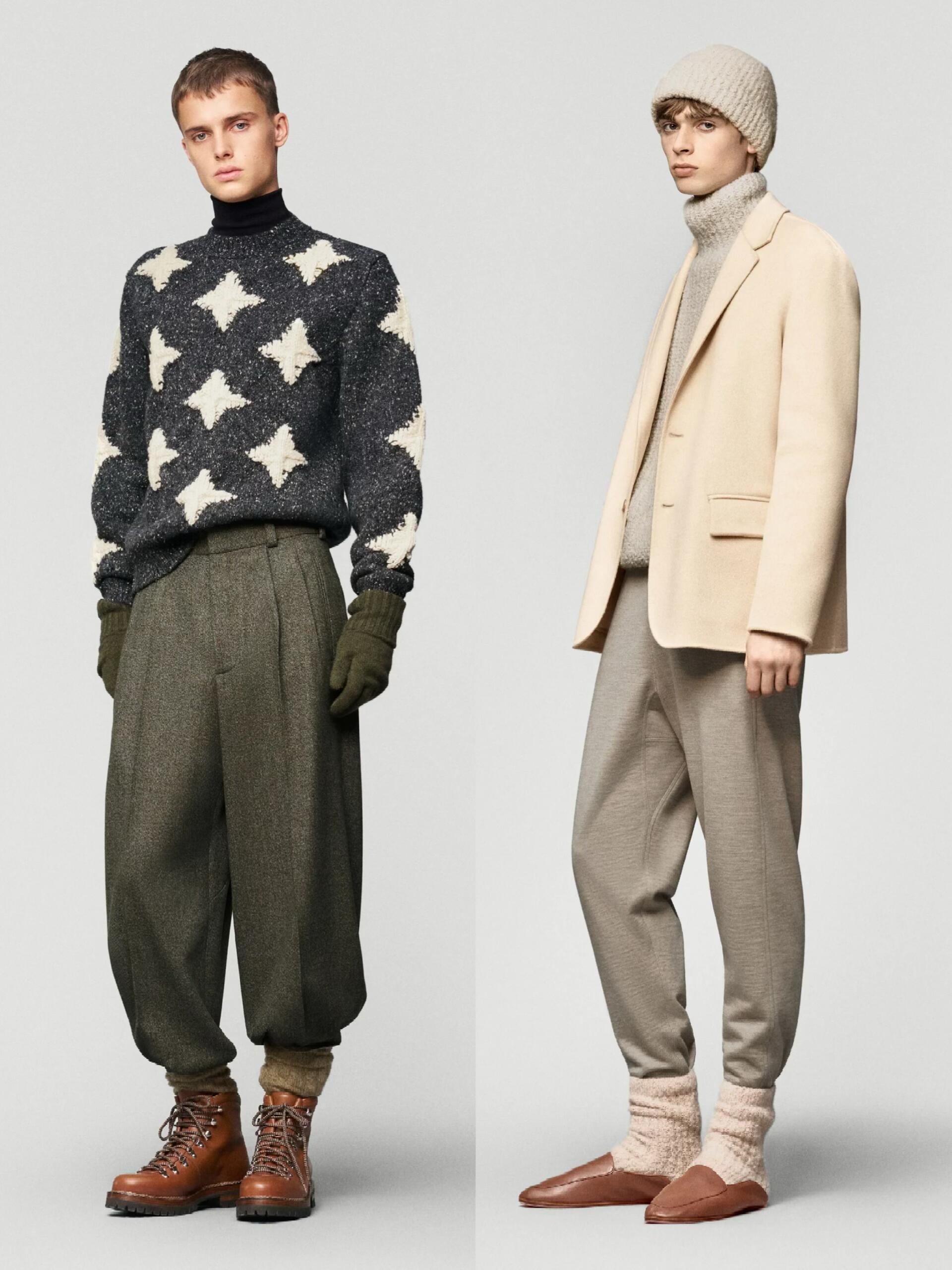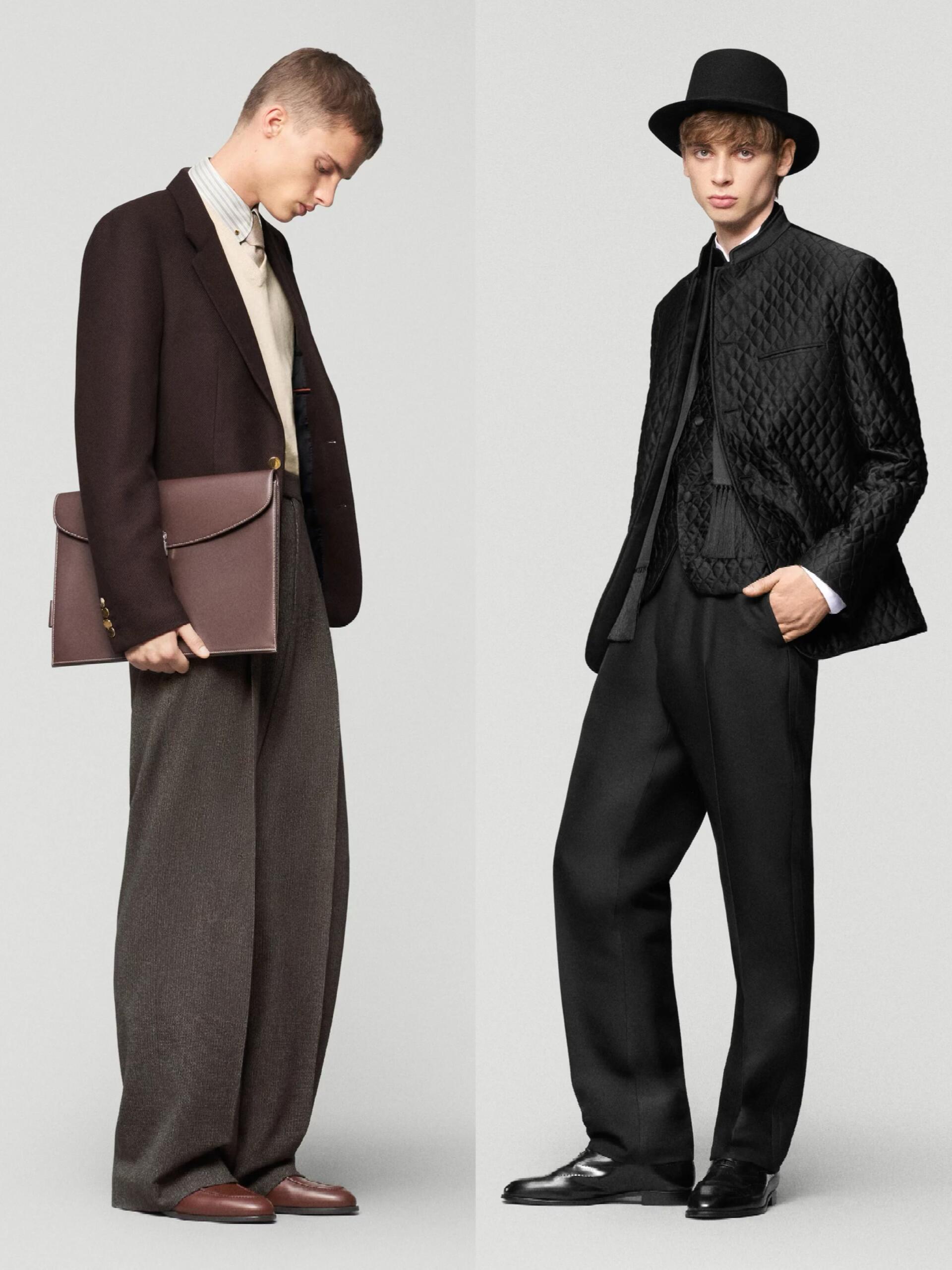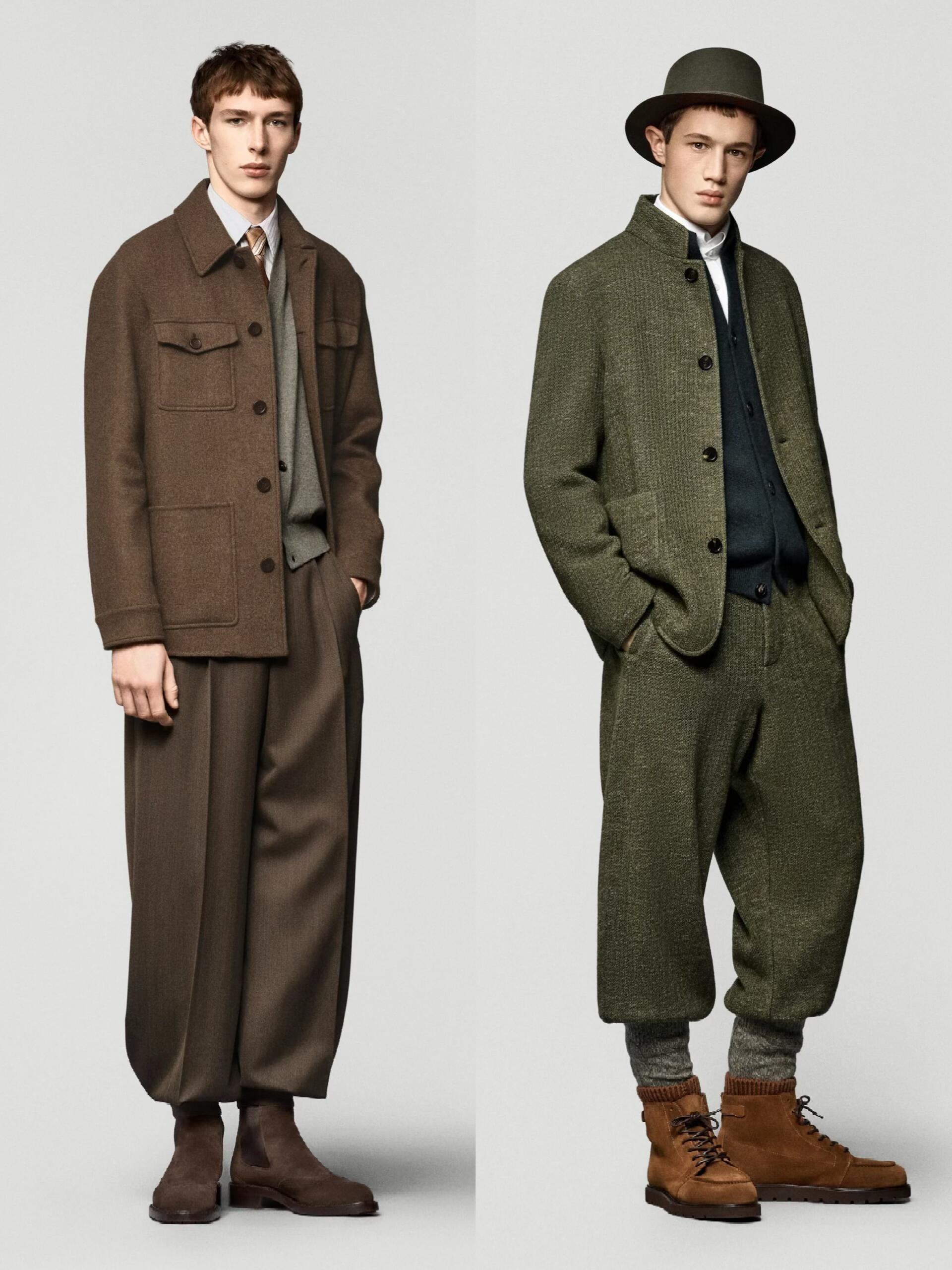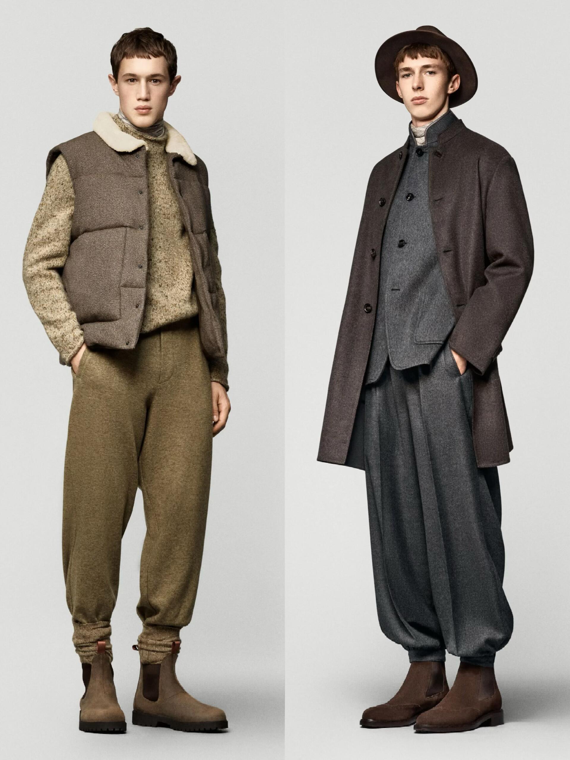 低温天懒人穿搭公式时尚灵感解读 低温天最温暖人心的还是老钱风穿搭。想拿捏秋冬男装的“老钱风”,核心在于“放松版型 + 顺色叠穿 + 精致配饰 + 硬朗田野细节”,跟着Loro Piana 20 秋冬男装系列学就对了。放松舒适的版型是基础,夹克、大衣、针织衫等单品都拒绝夸张收腰或紧身设计,优先保证穿着的松弛感与舒适度。标志性的高腰阔腿裤+裤脚收束设计,灵感源自南美放牧民族服饰,既给腿部留足活动空间、保证行动敏捷,又兼具保暖性,完美适配老钱们在牧场骑马打猎的假日场景。沉稳考究的顺色叠穿是精髓,整体以橄榄绿、烟草灰、深棕等大地色系为主,搭配黑白灰与米色,色调沉稳内敛,像《继承之战》里的富豪家族穿搭一样,不追求前卫夸张。穿搭以素色为主,杜绝logo老花堆叠,顺色叠穿的手法更是炉火纯青:高领衫+户外夹克、衬衫+V领衫+西装夹克、高领毛衣+长袖开衫+马甲,既能满足室内外不同场景的穿脱需求,又在低调中尽显品味。