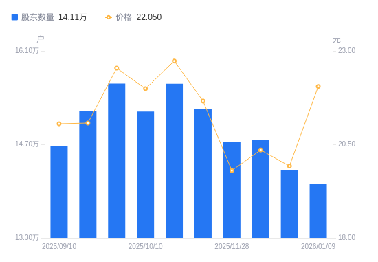 近一年(2025年1月10日至2026年1月9日),有研新材A股股东户数从14.65万户,减低至14.11万户,降幅3.73%,区间股价上涨42.62%。