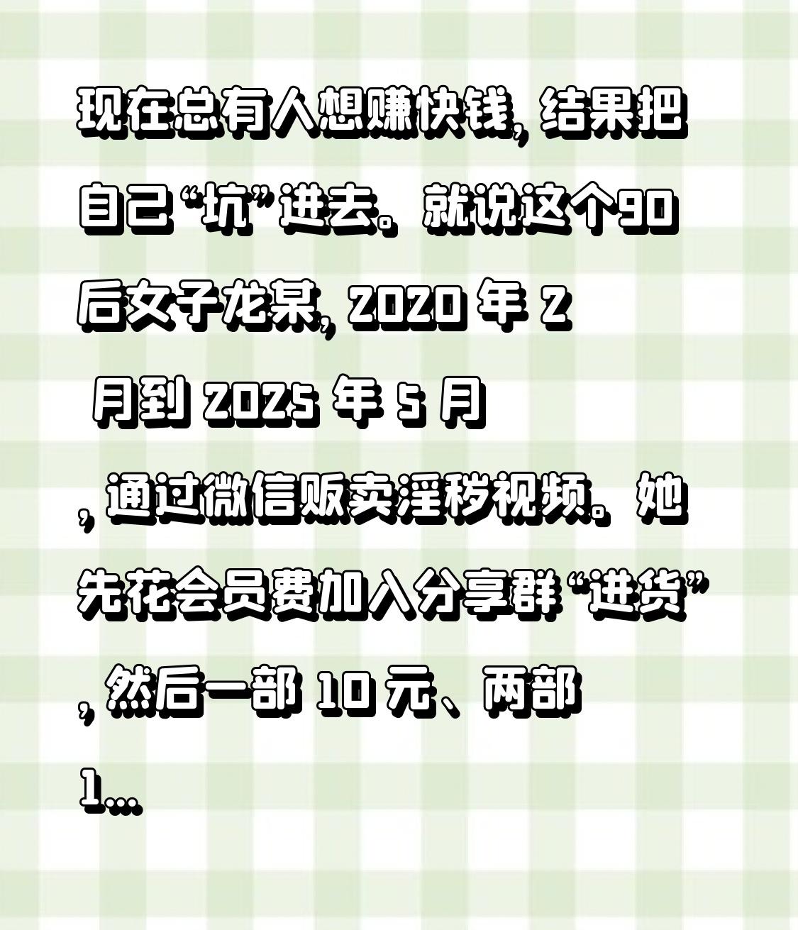 现在总有人想赚快钱,结果把自己“坑”进去。就说这个90后女子龙某,2020 年 2 月到 2025 年 5 月,通过微信贩卖淫秽视频。她先花会员费加入分享群“进货”,然后一部 10 元、两部 15 元这样卖,还按 68 - 128 元的标准介绍他人入群。像 2025 年 5 月卖给陈某 5 部,收 30 元;还卖给何某等人 16 部,收 118 元。最后她非法获利 36284 元淫秽犯罪