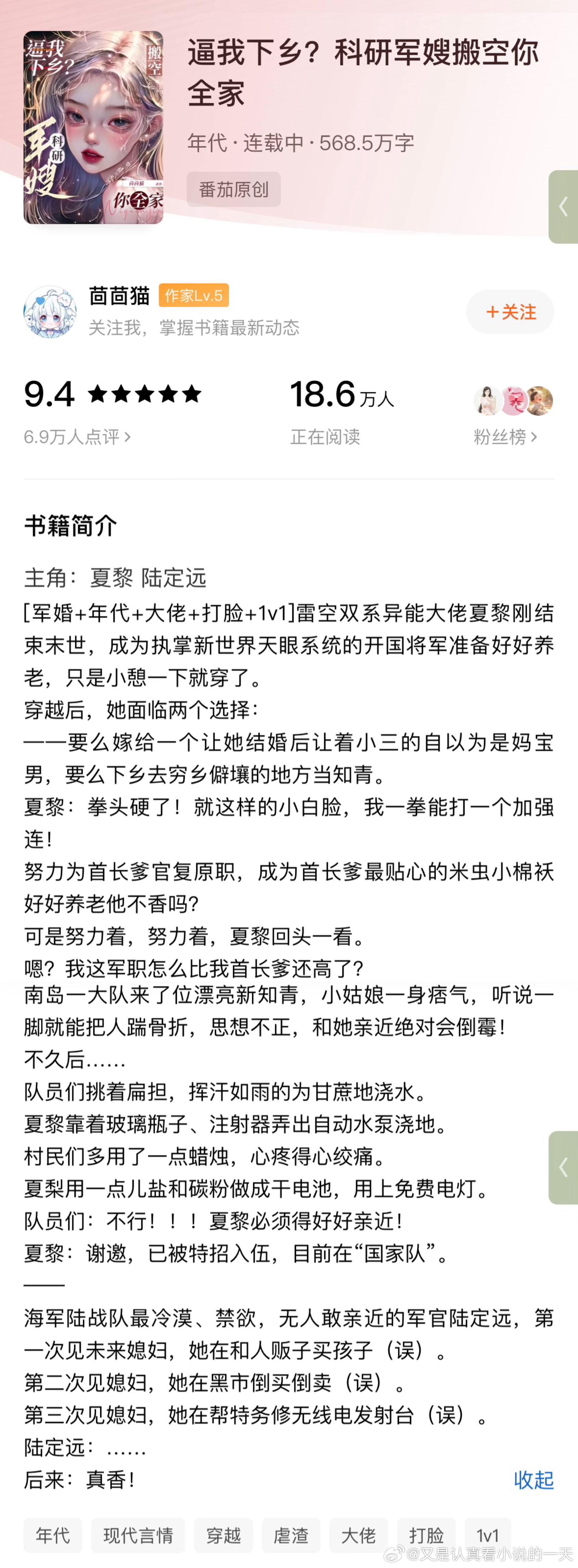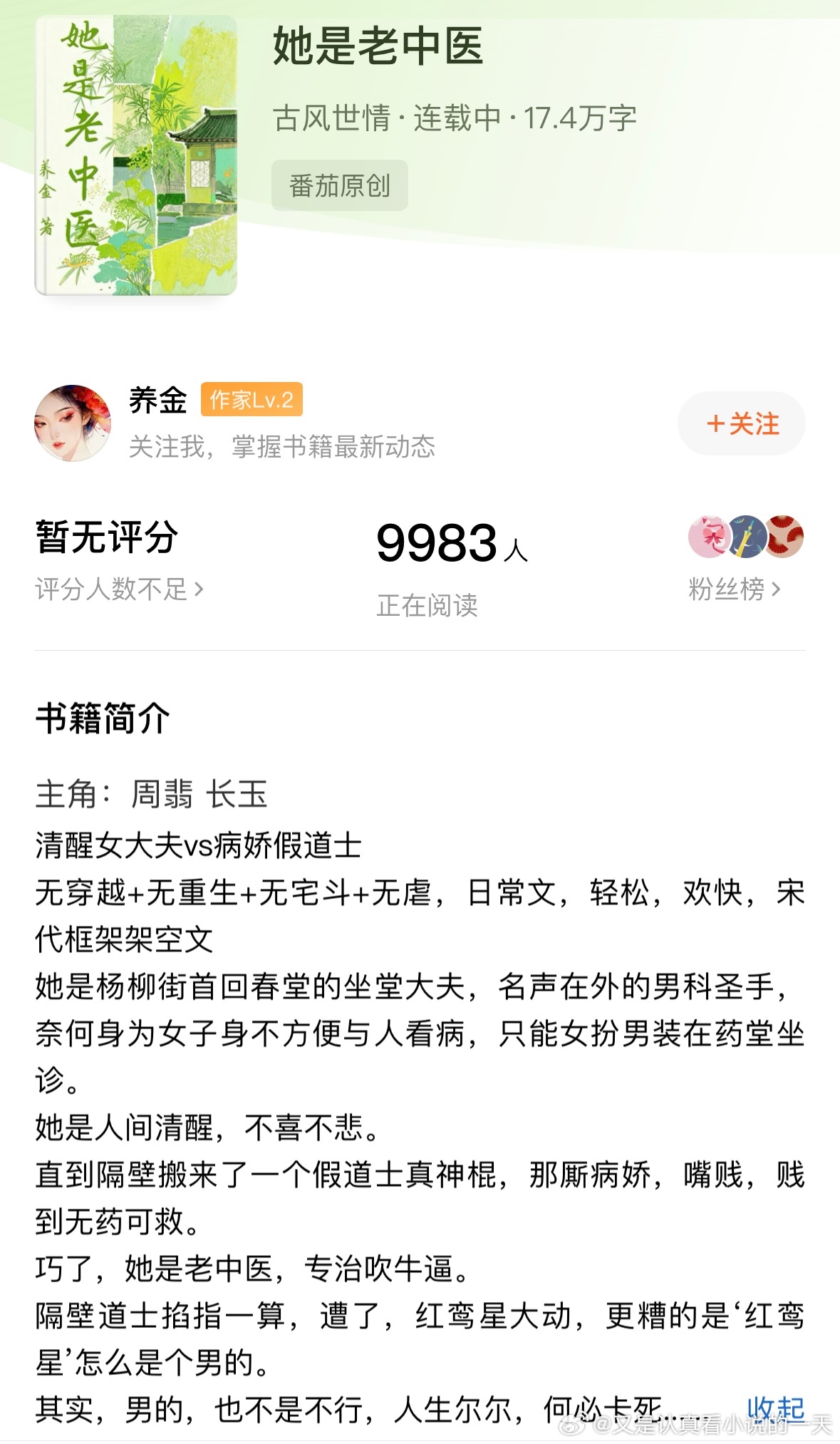 pick你心中的改编潜力王微博年度待改编ip评选 【追更好文】最近在追的3本番茄文①《逼我下乡,科研军嫂搬空你全家》by 茴茴猫长篇年代爽文,女主超强超飒,爽就完了②《缉凶:乡村杀人事件簿二》by 大白帆第一部挺好看的:网页链接年代单元刑侦文,还是熟悉的味道,已经更了5个案件③《她是老中医》by 养金女扮男装中医+算命很准的小道士,单元故事,文笔不错