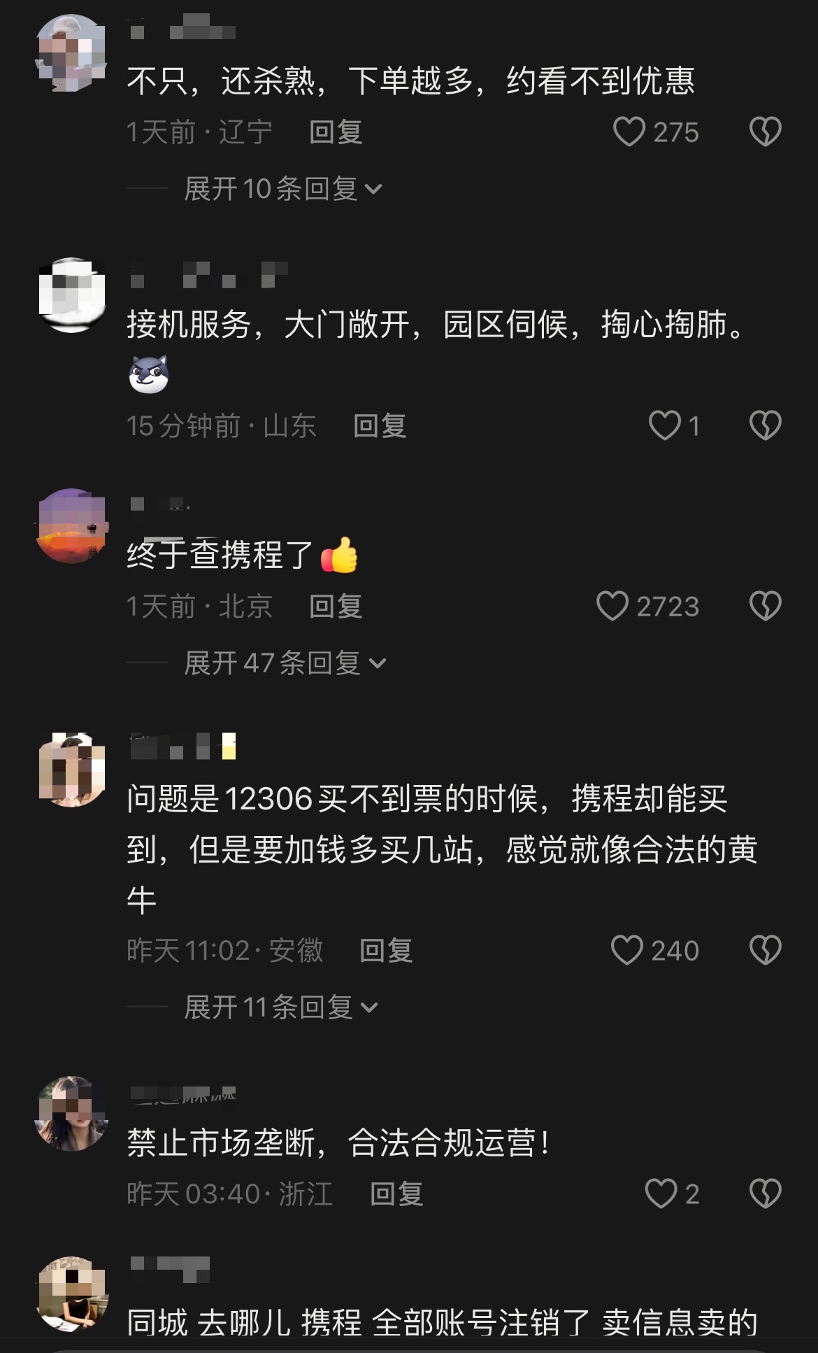 携程不知道大家有没有觉得,这次携程被立案调查评论区一片声讨,而明明早期的携程是那个改变了大家出行方式的必备软件。希望这次也能警示到其他行业龙头,另外,一个设想如果机票也能有一个12306对于大家买票会不会更安心?