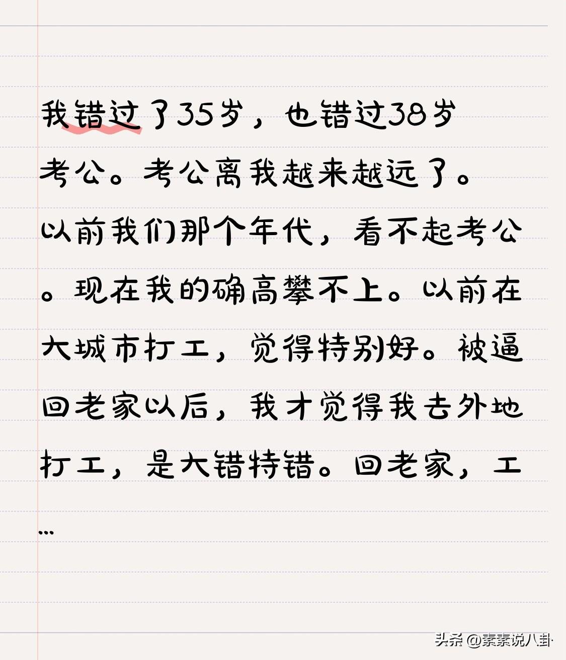 我错过了35岁,也错过38岁考公。考公离我越来越远了。 以前我们那个年代,看不起考公。现在我的确高攀不上。 以前在大城市打工,觉得特别好。被逼回老家以后,我才觉得我去外地打工,是大错特错。回老家,工作也没用。找工作到处碰壁。 现在政策放开了,对我而言,已经错过就错过了。