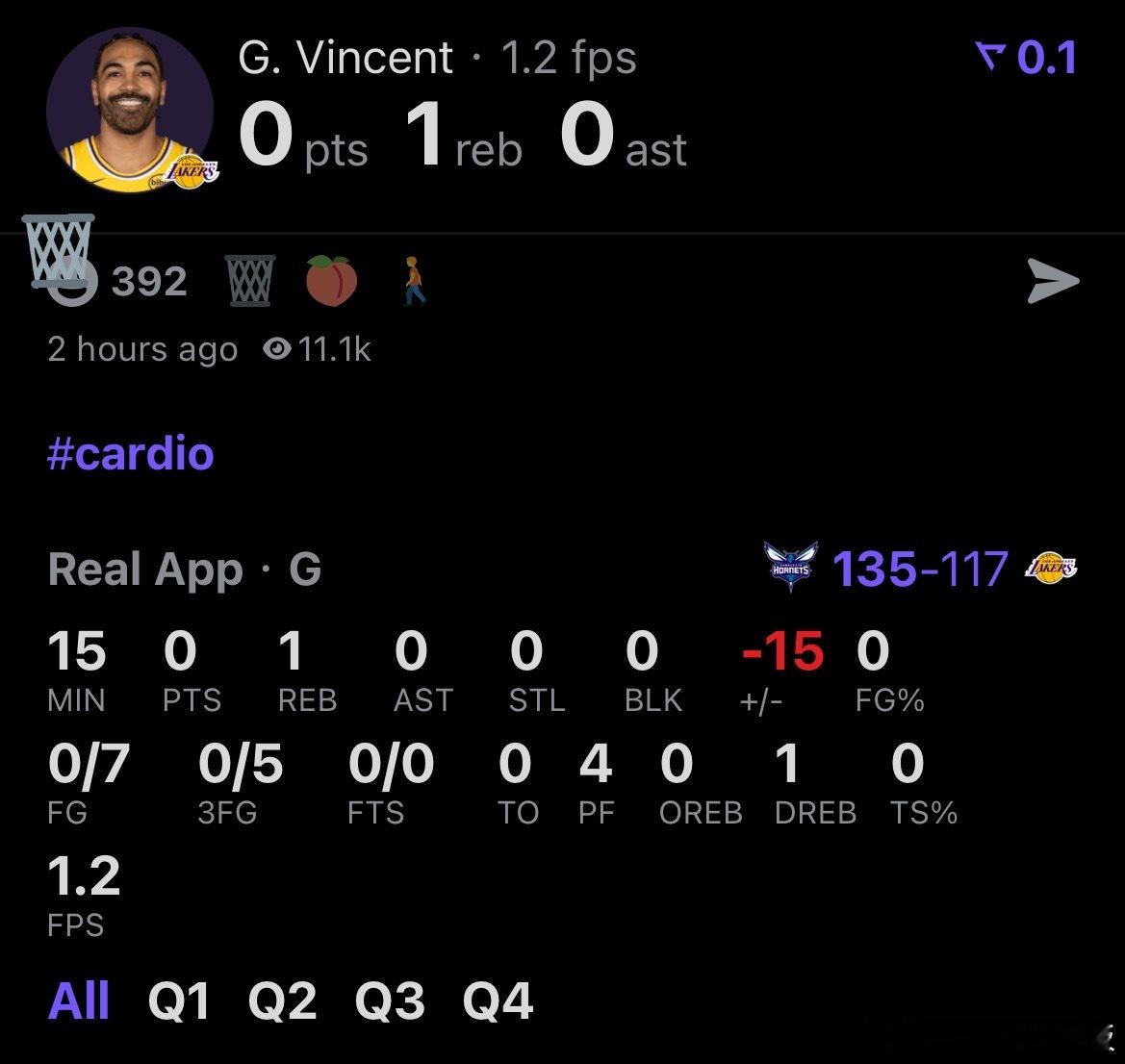 队记Dan Woike: 在文森特连续第7次投篮不中后,湖人主场响起阵阵嘘声😐文森特登场15分钟,0分1板4犯规黄蜂vs湖人