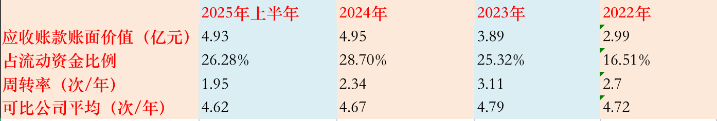 中图科技2022年至2025年上半年的应收账款周转率为2.7次/年、3.11次/年、2.34次/年、1.95次/年(2025年上半年已折算全年),不但较可比公司偏低,且还逐年走低。