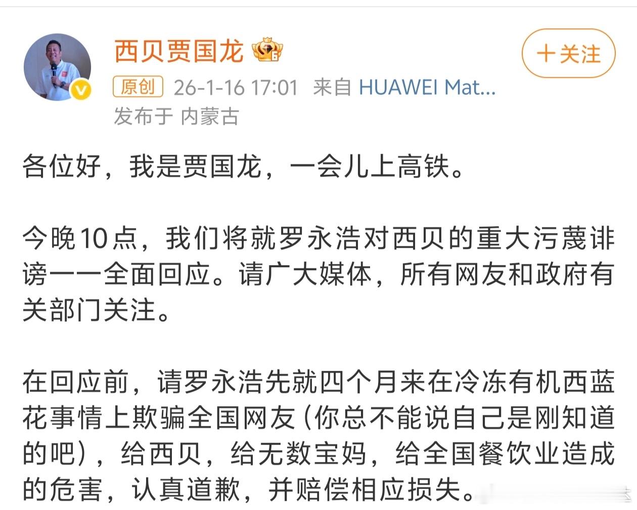 贾国龙发博说今晚十点将就罗永浩对西贝的重大污蔑进行全面回应,罗永浩随后转发了贾国