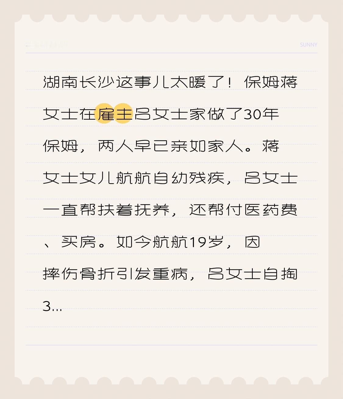 湖南长沙这事儿太暖了!保姆蒋女士在雇主吕女士家做了30年保姆,两人早已亲如家人。蒋女士女儿航航自幼残疾,吕女士一直帮扶着抚养,还帮付医药费、买房。 如今航航19岁,因摔伤骨折引发重病,吕女士自掏30万给孩子治病。她还说,孩子管自己叫奶奶,不甘心18岁的她就这么走了,一定要救。虽然有亲友劝阻,但她全力以赴。航航也特别想吕女士。这就是爱和善良的力量,希望航航能早日康复。 长沙保姆