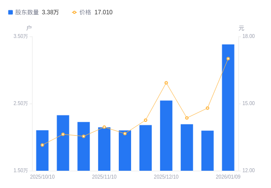 日期A股户数(户)流通A股户均持股数(股)户均持股市值(万元)2026-01-09338175660.179.632025-12-31209679129.1013.512025-12-19219268729.8112.542025-12-10254677516.0011.972025-11-28217968781.8812.522025-11-20210129109.5512.442025-11-10214728914.3912.442025-10-31222618598.4411.642025-10-20232798222.4311.212025-10-10210389098.2911.96