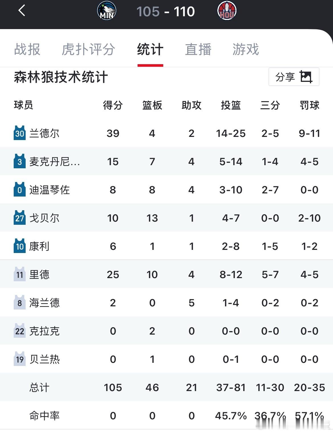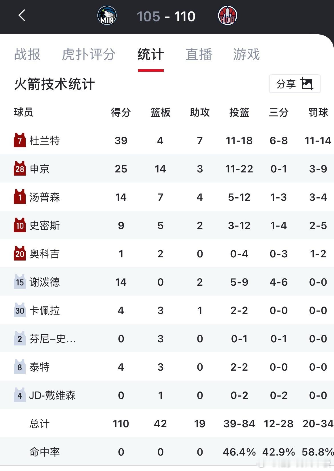 火箭主场110-105战胜森林狼,反超湖人升至西部第5。兰德尔39分,杜兰特39分,爱德华兹缺席森林狼vs火箭