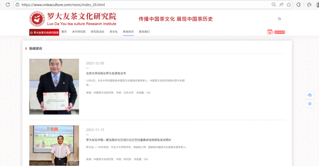 此前,记者搜索“中国茶文化研究院”发现,由罗大友发起的茶文化研究院网站有两个,均发布多篇文章介绍罗大友,并大幅展示其照片,宣扬其荣誉、头衔和“成就”。其中一个名为“罗大友茶文化研究院”的网站,还上传并轮番滚动展示罗大友的10余个荣誉证书。