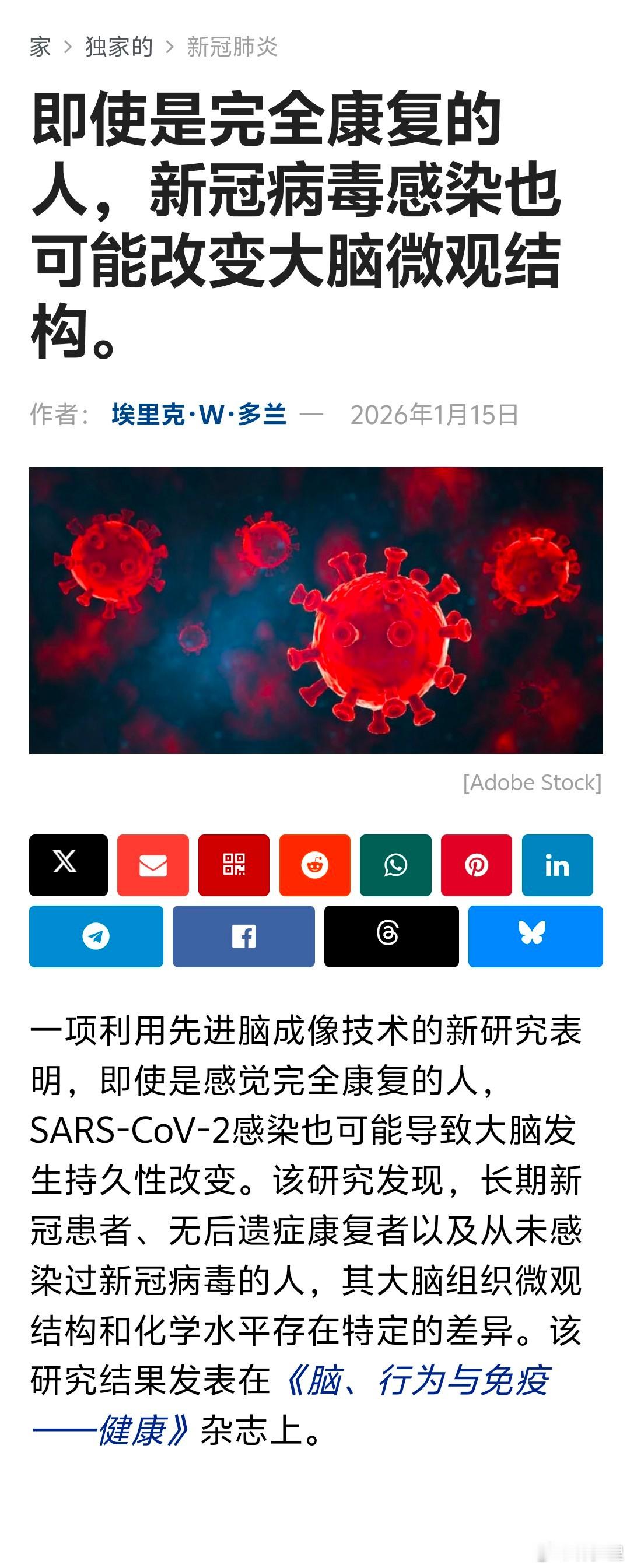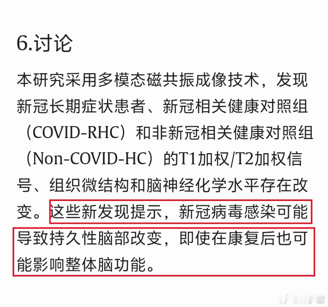 美国有斩杀线,中国有锁血盾。现在回想起来,那几年的新冠防控,何尝不是一种锁血机制?新冠已经有6年了,这六年中,越来越多的科学证据,表明了新冠的长远危害。比如一项新研究,利用脑成像技术,对比了长新冠患者、无后遗症康复者以及从未感染过新冠的人,在大脑组织微观结构和化学水平的差异。结果,发现:✨即使新冠康复后,没有后遗症的人,病毒也可能在大脑中留下痕迹,造成轻微的认知能力下降。康复者也可能被影响整体脑功能。试想若那三年,没有进行防控锁血,早早的躺平,会有什么下场?很多人会从2020年就开始感染,原始株、阿尔法、德尔塔…从2020年开始就造成健康破坏性的积累,有的人可能扛不过那三年。防控锁血机制,锁住了三年的健康与寿命。这三年的锁血,延缓了新冠病毒对健康与生命安全的破坏。真的,没那三年的锁血,很多人的健康都不知道成啥样了……没那三年的锁血,有的可能已经成高达了。参考:网页链接