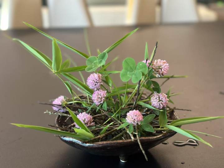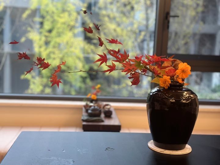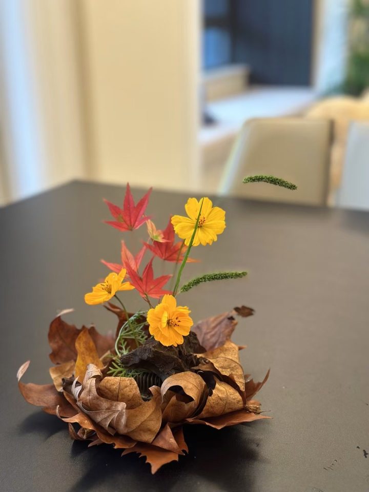 她的插花器皿也很有特色,有些是从大自然中寻找所得,比如枯树皮和枯树叶。插花素材都是山上即兴选摘,经过她的手一顿捯饬,立马成为桌面艺术。