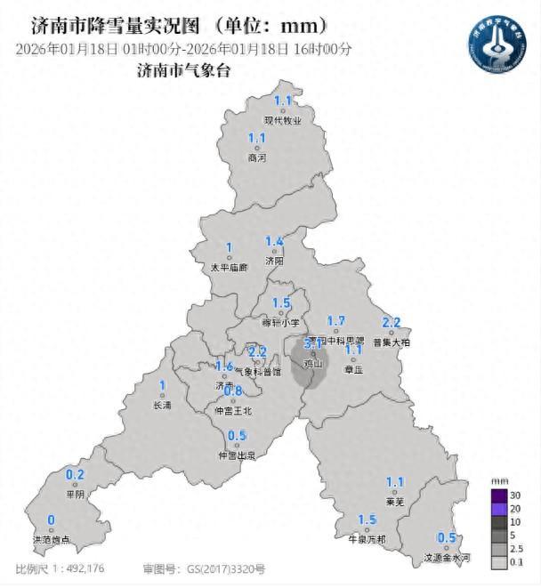 根据气象观测站网统计,2026年1月18日01时00分至2026年1月18日16时00分降水量(毫米):全市平均1.2(高新区鸡山最大3.1),折合水量约0.12亿立方米,市区1.6、长清区1.1、平阴县0.1、济阳区1.4、商河县1.1、章丘区1.7、莱芜区1.3、钢城区0.5、南部山区0.7、起步区1.0、历城区2.2、高新区2.3。