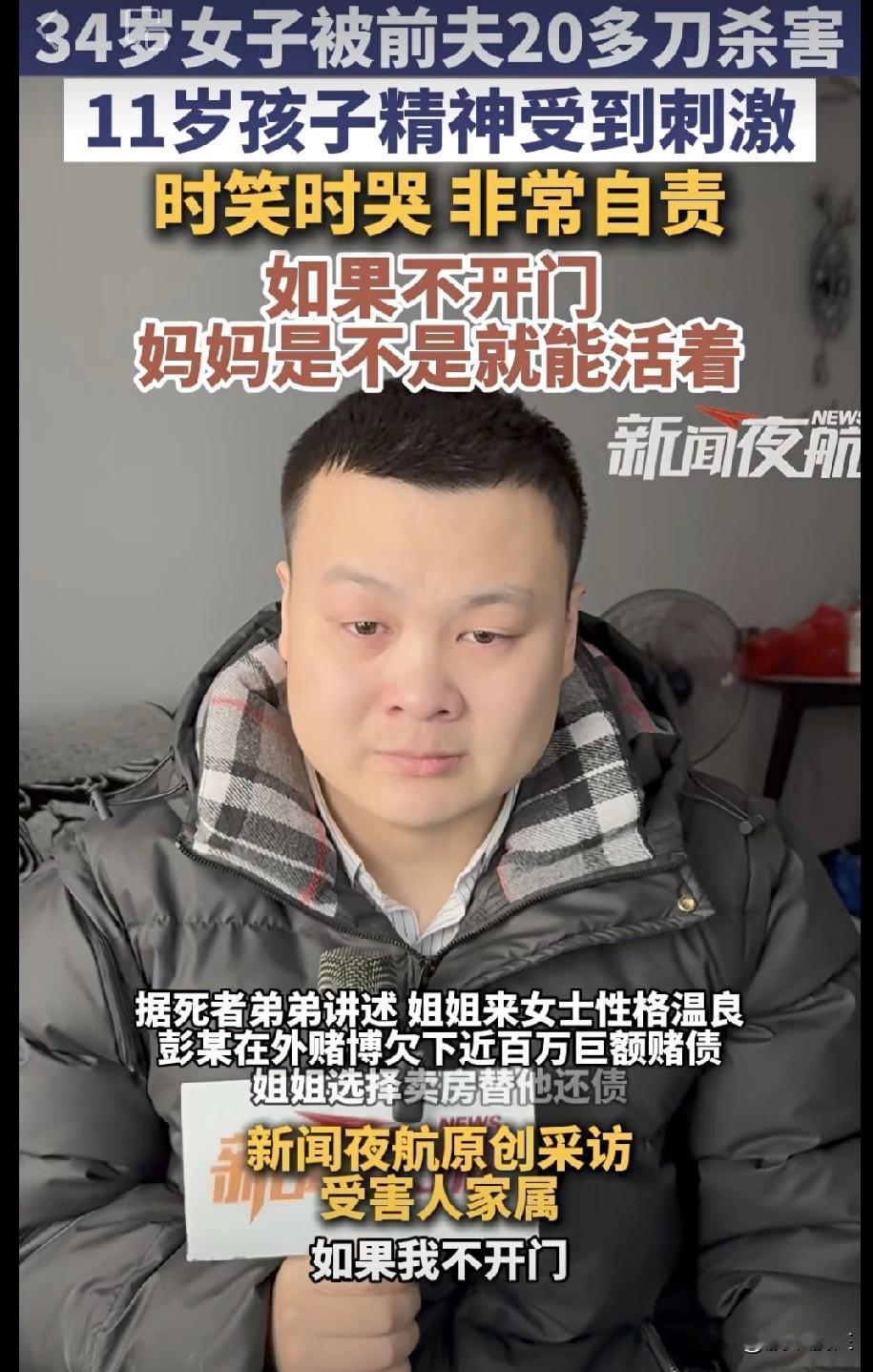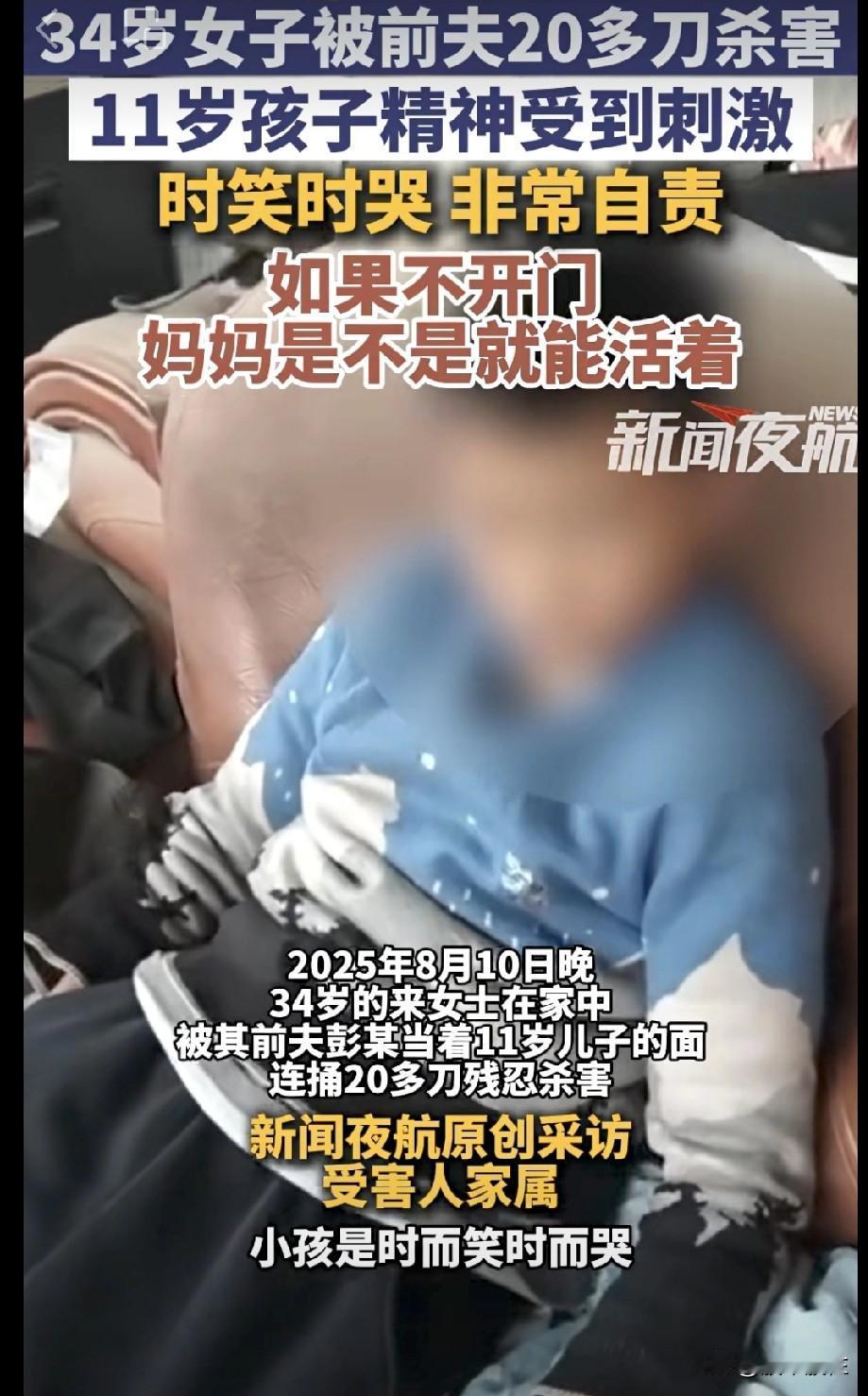 临沂杀妈妈案, 人怎么可以这么坏。 看到前妻离开自己过得好了,就下这么狠的手。连自己的孩子也不放过。 34岁女子被其前夫彭某当着11岁儿子的面,连捅20多刀残忍杀害。11岁孩子精神受到刺激,时笑时哭 非常自责,“如果不开门 ,妈妈是不是就能活着。” 害人之心不可有,防人之心不可无啊。有些人已经没有道德底线,对于这样的人,不但要远离,而且要有防范意识。任何时候都要往最坏处想,把自己的生命安全排在第一位。 婚姻就是命运的转折点,选对人,幸福一生。选错人有可能把命都搭上了。对于那些骨子里就坏的人,还是趁早远离。