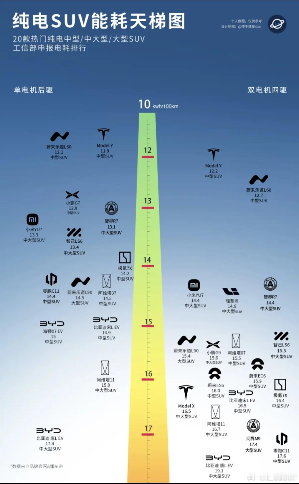 买了电车能一周充一次吗汽场全开大v聊车 统计数据显示99%的上班族每天通勤距离在52.6(跨城通勤均值)以内,再加上周末驾车游玩,一周内完整行驶里程不超过400Km。所以续航里程能达到400Km就是可以解决99%的用车场景。也就是说实际续航里程超过400km的新能源汽车都可以满足一周一次的使用场景。新能源车辆电耗影响因素:车重、气温、驾驶习惯、风阻、载重都会显著改变能耗(冬季开热空调可使电耗上升30%+)根据当前市场数据,国内纯电动乘用车平均能耗情况近年加权平均(单位:kWh/100km):2024年约14.41;此前2022年约13.41(受车型大型化影响小幅上升)日常综合实测区间(家用主流):微型车:约9-11紧凑型轿车:约12-15中大型轿车/SUV:约16-19(高速可达20+)(单位:市场整体平均(不含极端车型):约14-15(单位:kWh/100km)(NEDC/WLTC工况),实际道路平均约15-16(单位:kWh/100km);综上,只要电池容量达到60kwh以上新能源汽车都可以实现一周充电一次的低频充电场景!