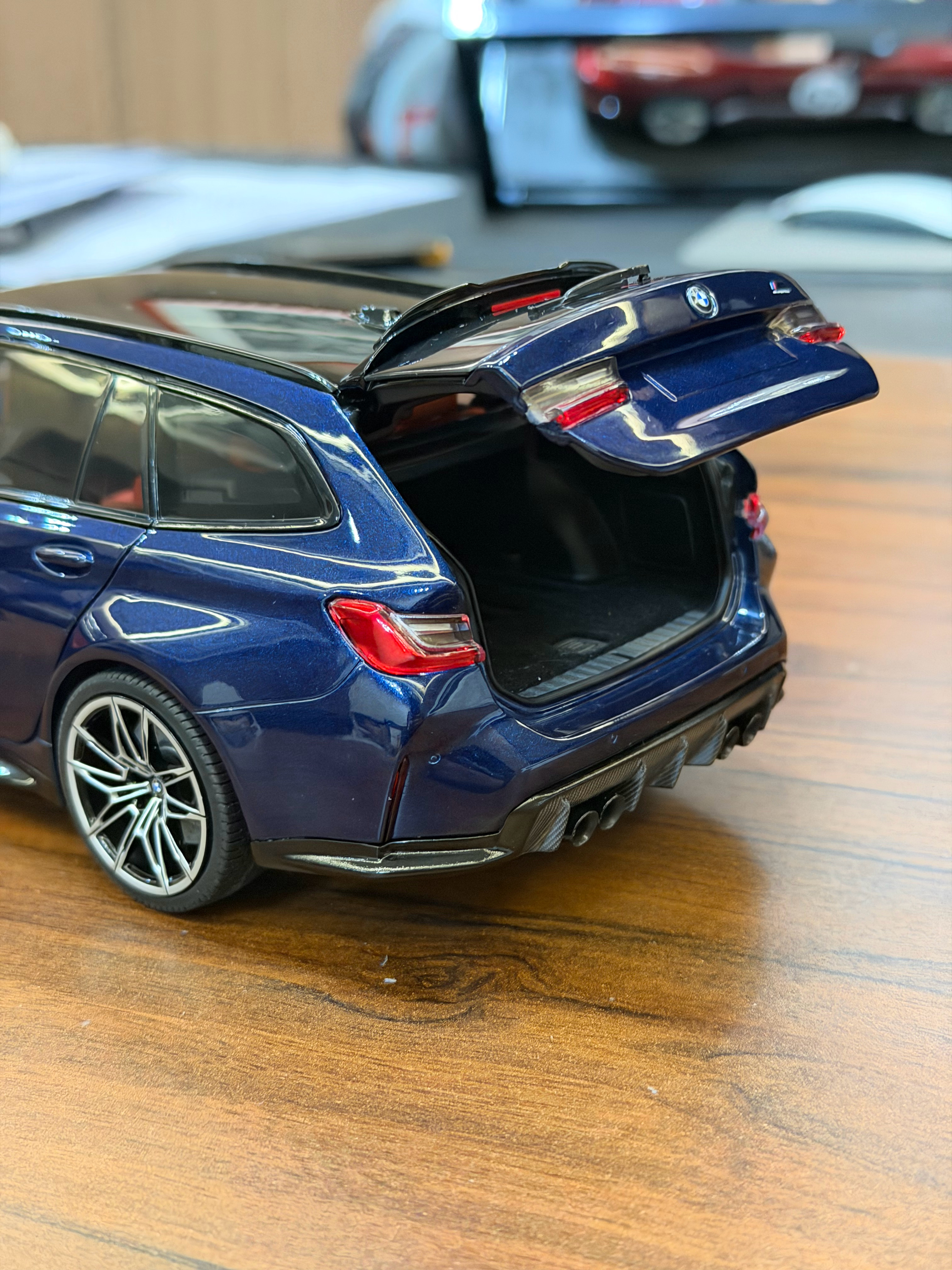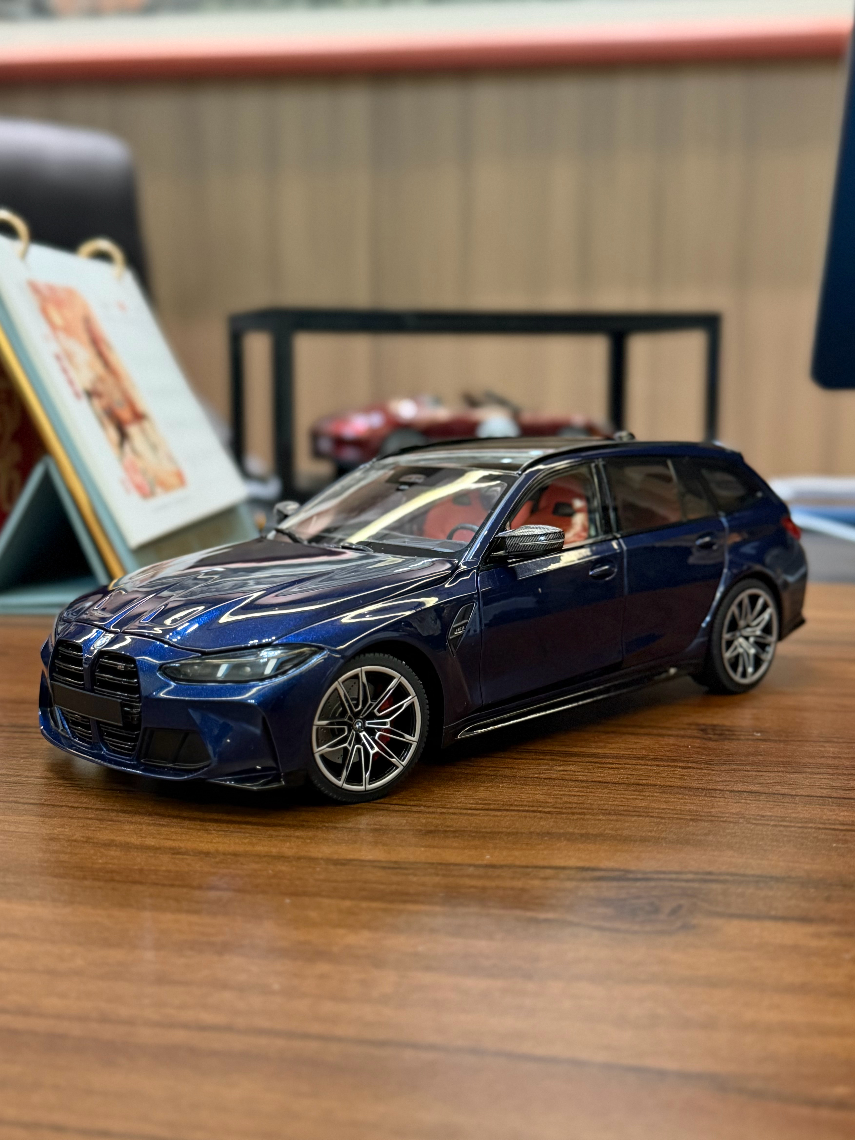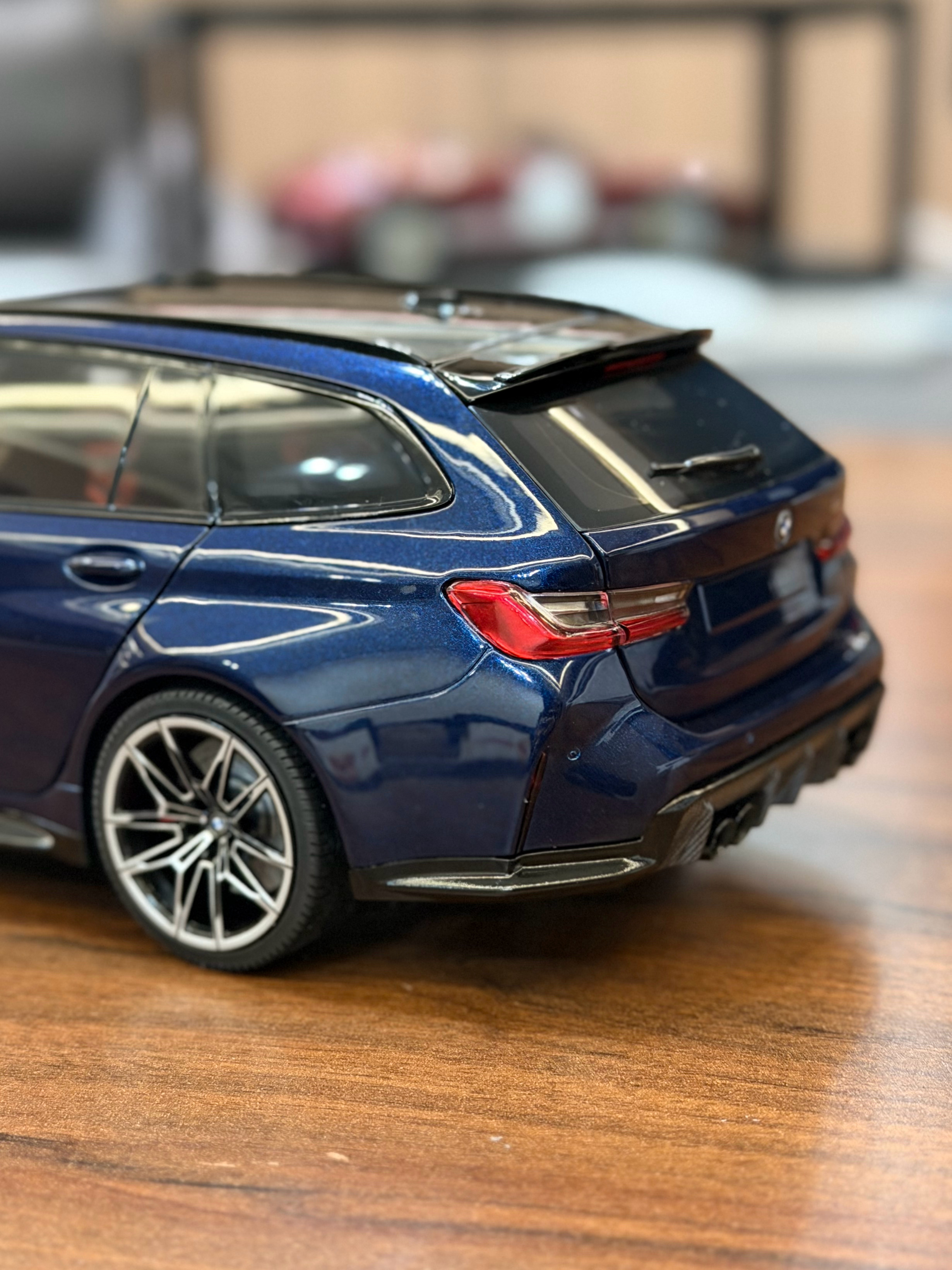 Sergio的摄影库 模型分享PT54-迷你切 G81 M3 Touring终于拿到18全开的G81了,迷你切这次做的相对还是不错的,型准和内饰等感觉都比之前的G8X稍微锐利一点,这个丹泉石蓝无论是颜色还是质感还原都还是不错的,并且这次经过重新设计的包装盒是真的非常漂亮,很加分不过还是一样,内饰的搭配不够完美,当时预定写的是棕内,最后出货变成了橙内,不过倒还好不是配红内,然后前盖这个缝隙问题还是没解决,缝隙大的感觉前嘴一套了,且没有把后窗单独可开这个比较特色的点做出来也还是挺可惜的不过总的来说如果真的很喜欢G81,这台车还是值得收的