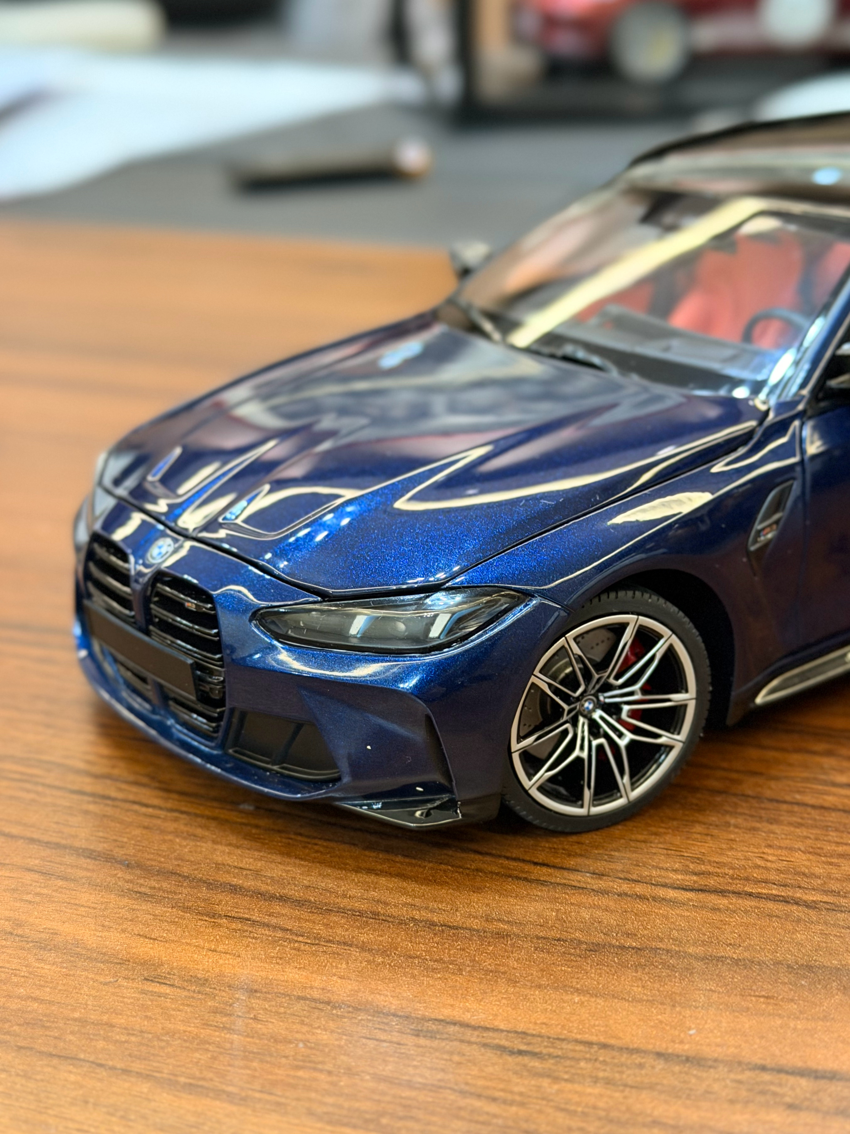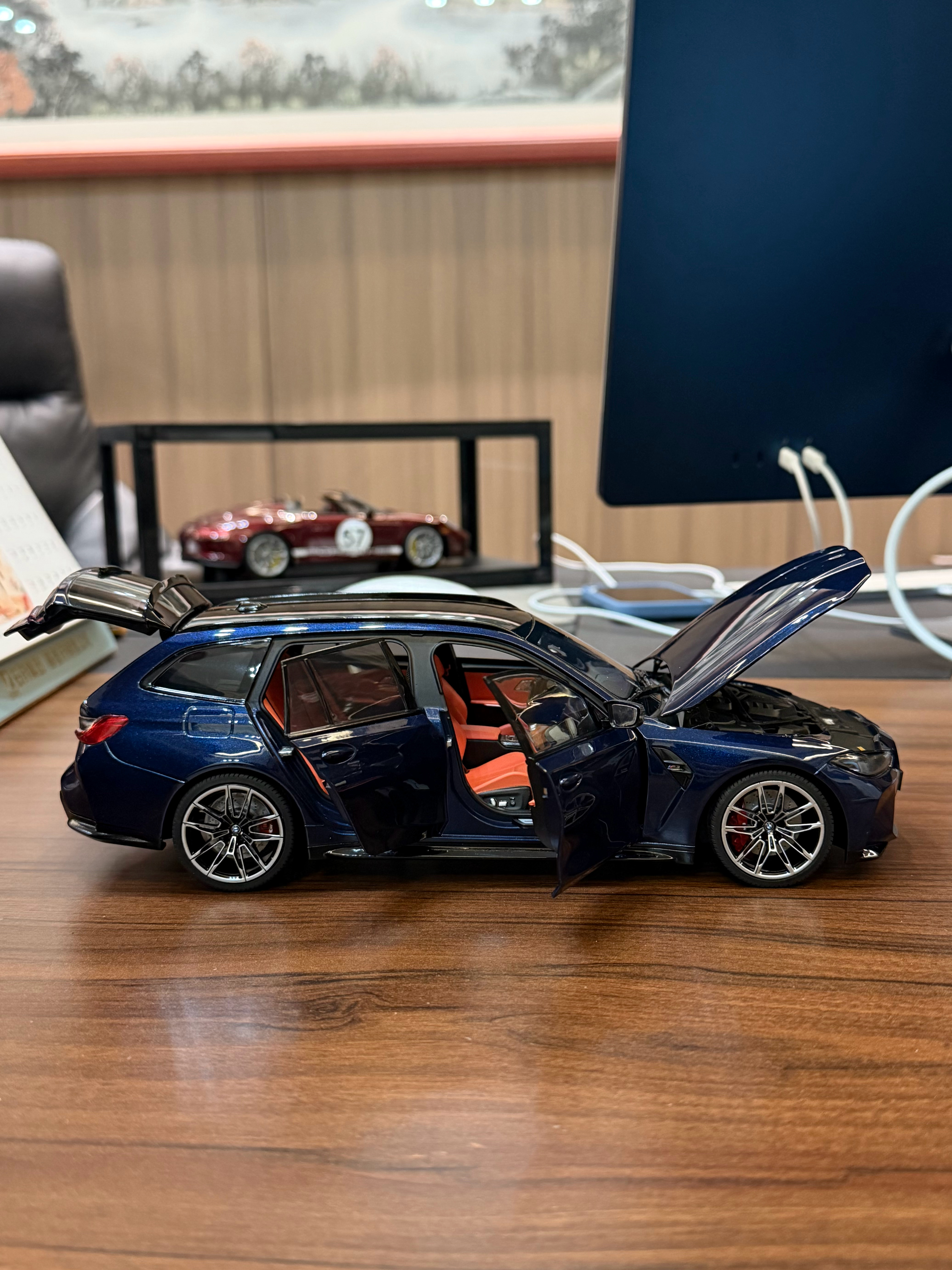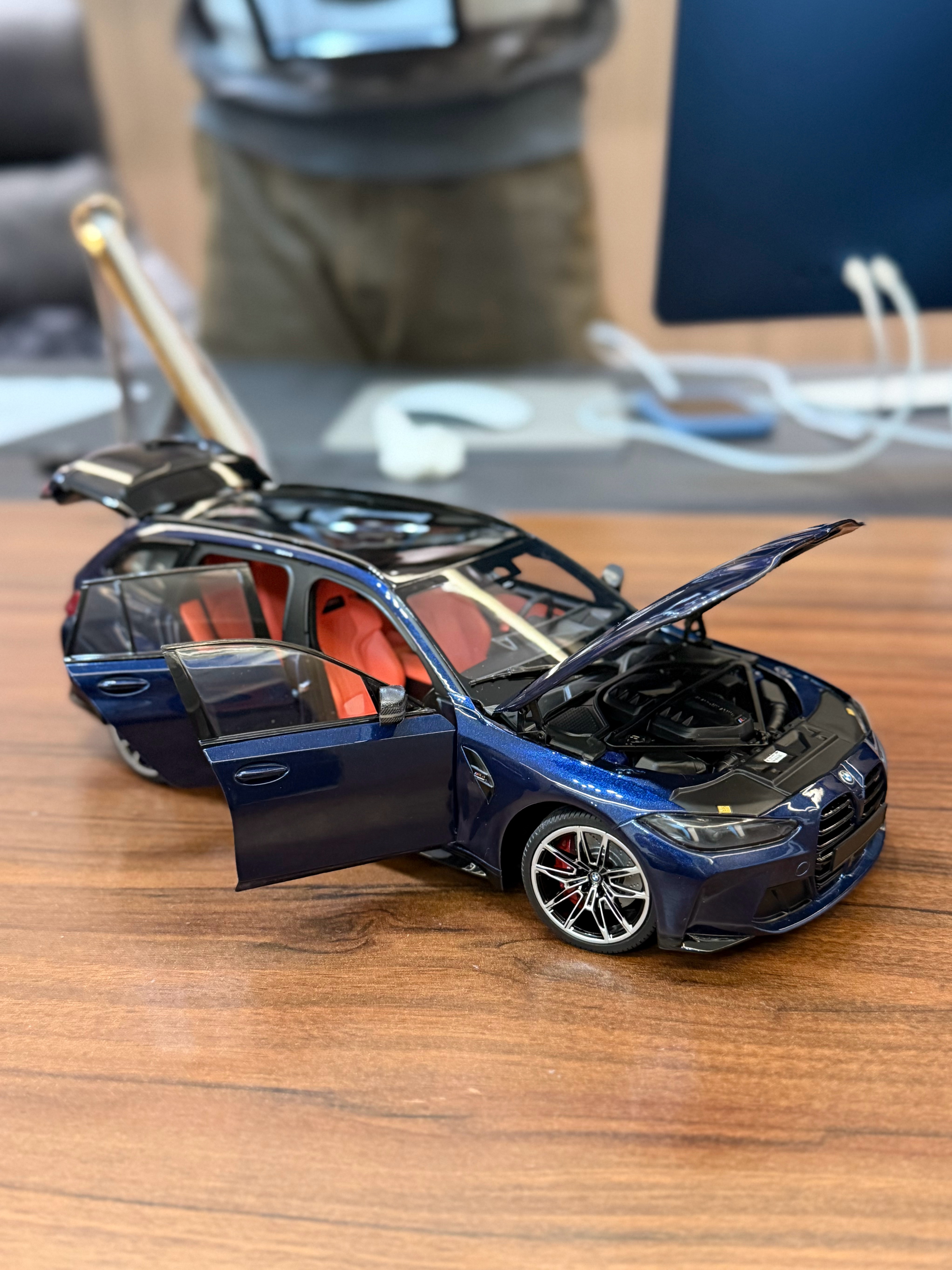 Sergio的摄影库 模型分享PT54-迷你切 G81 M3 Touring终于拿到18全开的G81了,迷你切这次做的相对还是不错的,型准和内饰等感觉都比之前的G8X稍微锐利一点,这个丹泉石蓝无论是颜色还是质感还原都还是不错的,并且这次经过重新设计的包装盒是真的非常漂亮,很加分不过还是一样,内饰的搭配不够完美,当时预定写的是棕内,最后出货变成了橙内,不过倒还好不是配红内,然后前盖这个缝隙问题还是没解决,缝隙大的感觉前嘴一套了,且没有把后窗单独可开这个比较特色的点做出来也还是挺可惜的不过总的来说如果真的很喜欢G81,这台车还是值得收的