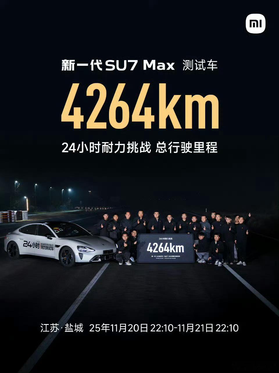 小米新SU7刷新24小时耐力挑战纪录 新一代小米 SU7 在 24h 耐力赛中刷出了新成绩,回顾一下之前的战绩:• 小米 YU7:3944 km• 小鹏 P7:3961 km• 新一代小米 SU7:4264 km 连跑 24 小时,哪怕多挤出一公里,都是在考验这车耐不耐造、会不会过热、充电能不能跟上。新一代SU7大v聊车