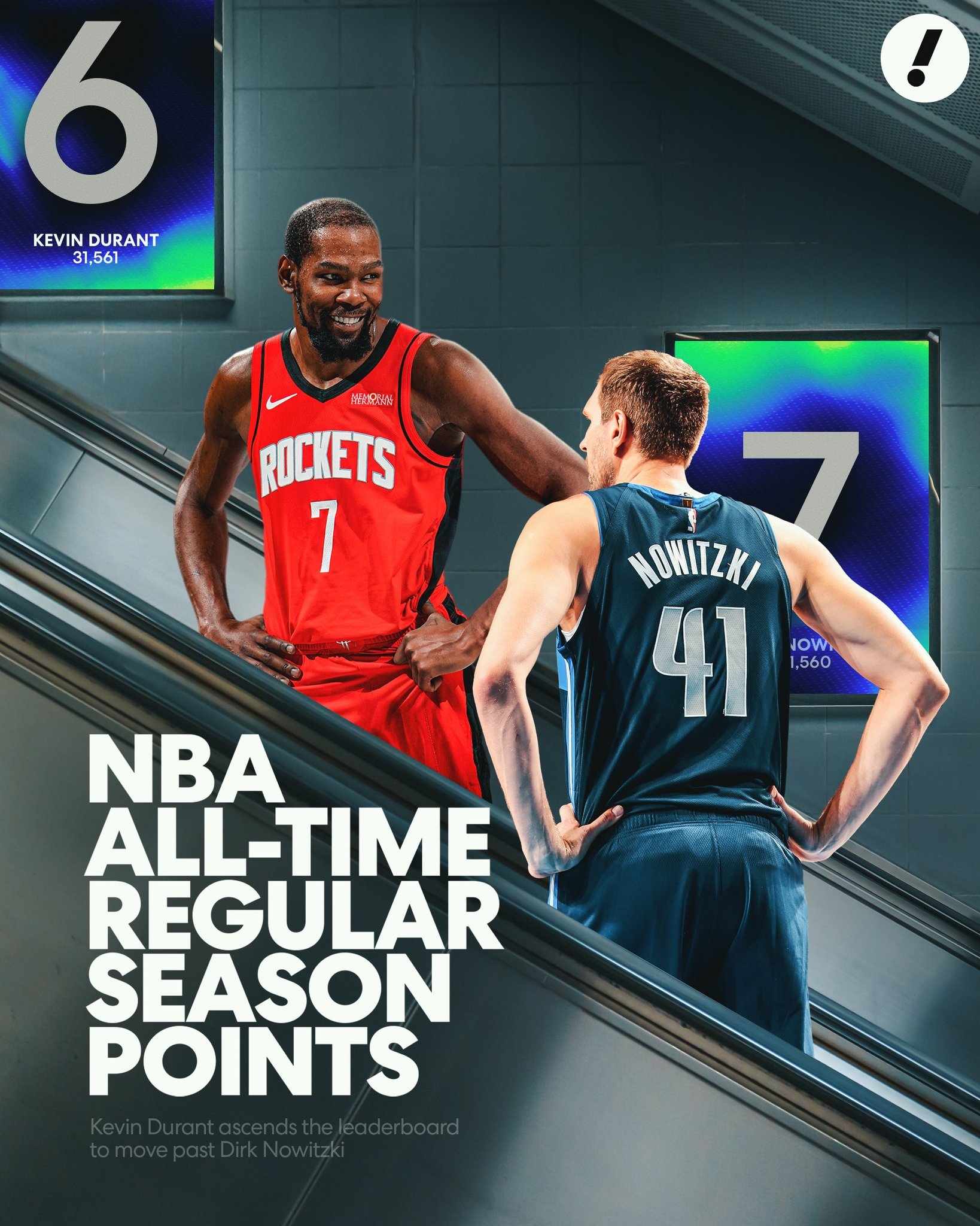 KD总得分超越诺维茨基,升至历史第六,下一个目标是乔丹鹈鹕vs火箭