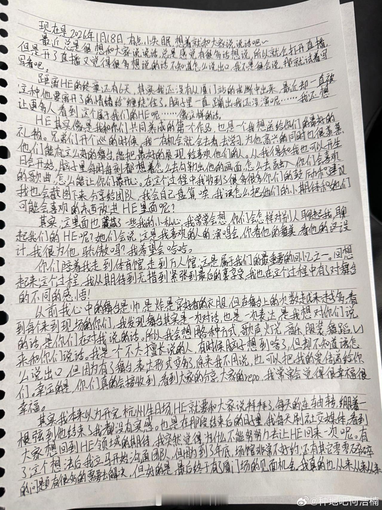 何浩楠给粉丝的手写信 看了写给粉丝的手写信,这完全是真诚小狗来的!HE的终章上海站马上就要来了,小何深夜手写千字信给粉丝表达感谢和不舍。他说HE是礼物,却不知这份真诚本身,才是最动人的。小何“不会说但会做”的含金量还在上升~
