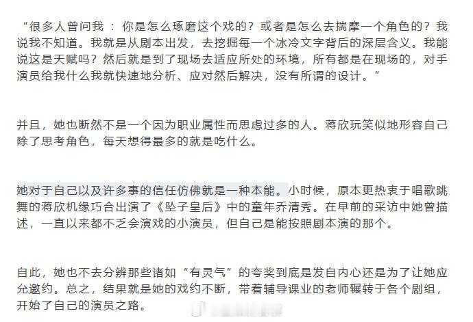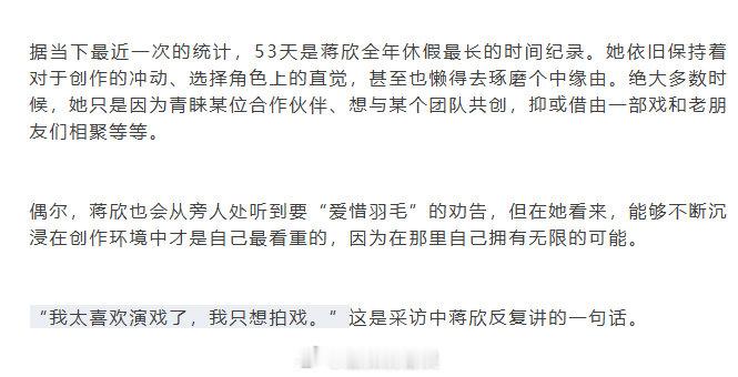 蒋欣全年休假最长纪录是53天蒋欣每天除了思考角色就是吃什么 《InStyle优家》采访曝光,据当下最近一次的统计,53天是蒋欣全年休假最长纪录。蒋欣还玩笑似地形容自己除了思考角色,每天想得最多的就是吃什么。