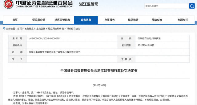 此外,浙江证监局还对金永荣采取3年证券市场禁入措施。自宣布决定之日起,在禁入期间内,其不得直接或以化名、借他人名义在证券交易场所交易上市或挂牌的所有证券。
