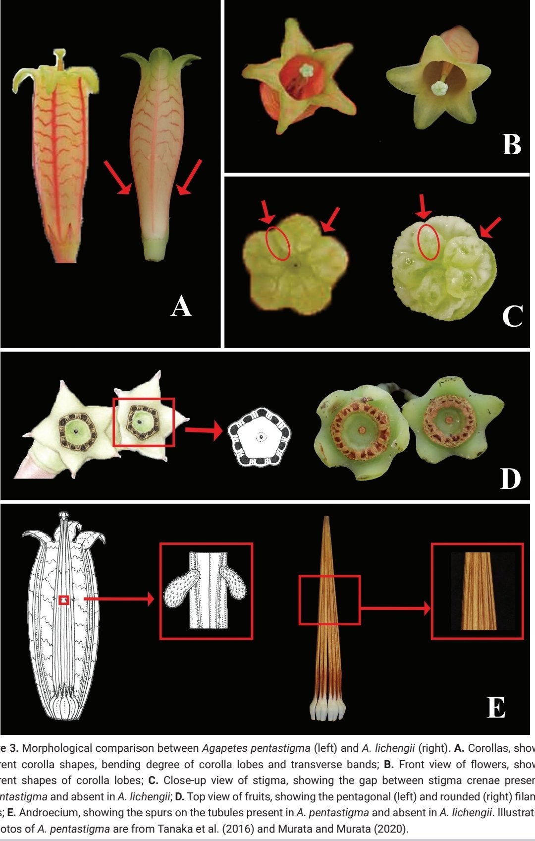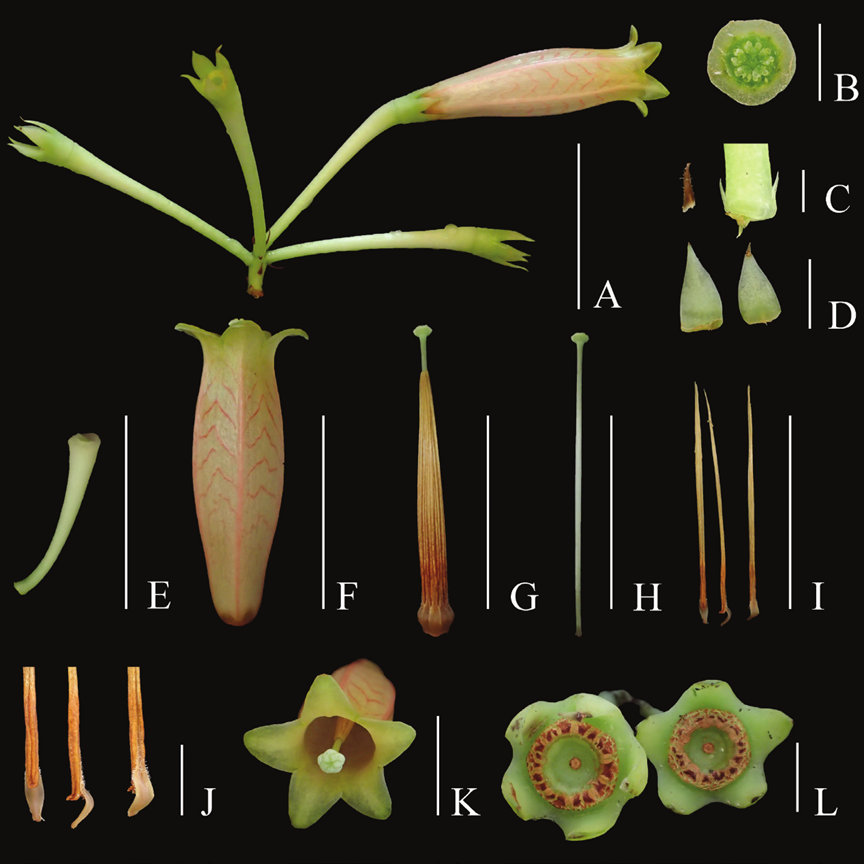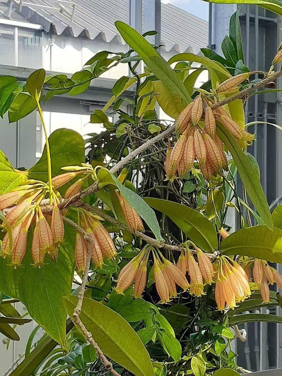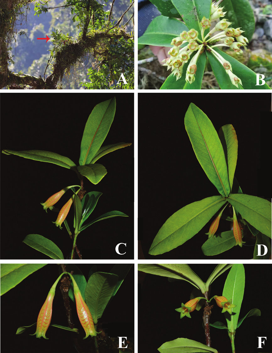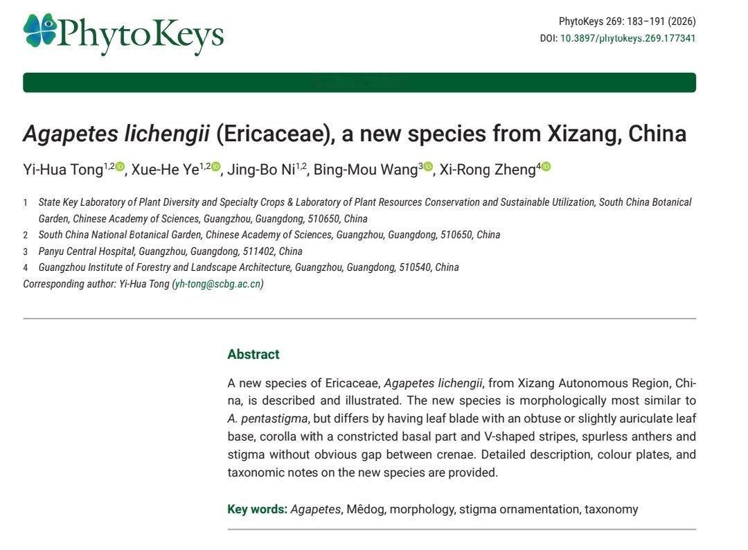 2026年新年开始收到了来自朋友们最好的礼物,2024年1月中国科学院华南国家植物园组织的竹类与杜鹃花科专项考察发现的一种树萝卜属植物终于在知名植物分类学刊《PhytoKeys》发表了,承蒙朋友们厚爱,该物种以我的名字作为种加词命名,中文名为:李成树萝卜(Agapetes lichengii Y.H.Tong & B.M.Wang),深耕藏东南十余年,能得到同行们的认可是我最大的荣誉,也是激励前行的动力,感谢童毅华博士和阿毛兄、波哥。也感谢墨脱县林草局和北京大学自然保护与社会发展研究中心的支持,这种树萝卜是低海拔湿润雨林的大型树萝卜,其花朵较大开花密集,拥有树萝卜属中少见的橙色花筒与红色纹理,仅分布在墨脱县海拔700米以下的热带常绿雨林中,附生于雨林突出层与主林层大树的林冠上,分布区非常狭窄,目前仅发现几株,这里是青藏高原东南坡植被垂直带谱的最底层,具有重要的区系指示意义与科研价值,其最近缘种A. pentastigma(图五)分布于缅甸胡康河谷的龙脑香热带雨林中,但李成树萝卜与A. pentastigma的花、果、叶都拥有非常明显的形态差异(图六)