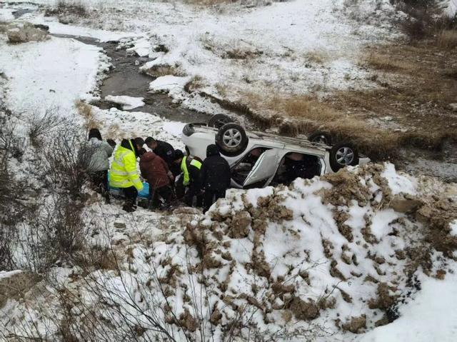 2026年1月17日9时54分,大同市灵丘县西口庄往北小桥路段,因持续降雪导致路面湿滑结冰,一辆载有一家五口的小轿车行驶中失控,不慎驶出路外坠桥,驾驶员徐某某因脊柱受伤被困车内,无法自主行动,其余乘车人虽无大碍但情绪紧张,现场情况危急。