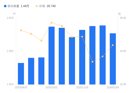 日期A股户数(户)流通A股户均持股数(股)户均持股市值(万元)2026-01-091444913584.5836.332025-12-191473413321.8133.812025-12-101471013343.5533.002025-11-281457113470.8437.402025-11-201430913717.4938.022025-11-101464613401.8638.922025-10-311468913362.6239.352025-10-201357814456.0039.452025-10-101356214473.0640.672025-09-301337614674.3141.85