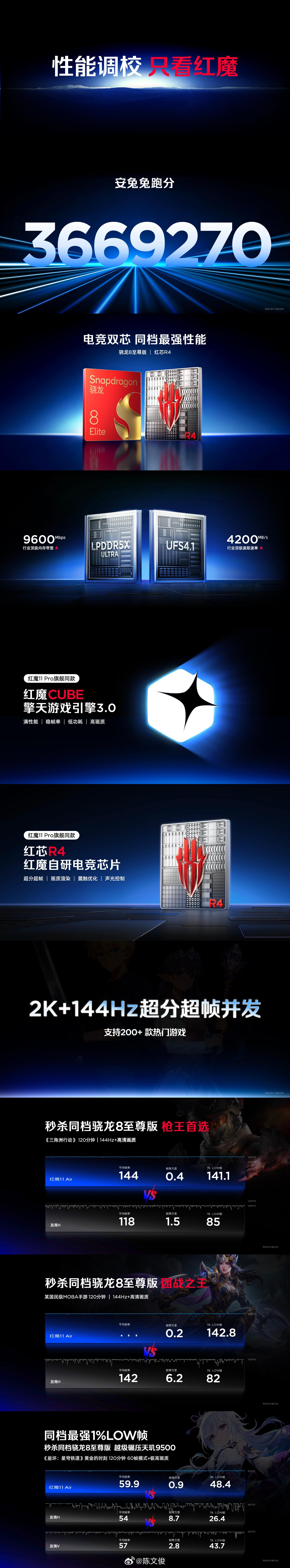 红魔11 Air来了,设计、配置依然强大。设计同样是遵循Air系列的超薄设计,但相比于上一代,增加了更明显的RGB灯和散热风扇,情绪价值和游戏性能拉满。有意思的是,这次机身后盖玻璃用了3D弧形后盖,这跟之前的红魔手机都不一样,横向握持手机对手指更友好。真全面屏自然是个大卖点,超过95%的屏占比,1.5K+144Hz刷新率,这次红魔也着重提了一下屏幕护眼性能。至于配置,高通骁龙8 Elite处理器,安兔兔跑分超过366万,加上红魔自家的电竞引擎,游戏性能、帧率、画质拉满。这次的散热风扇特别根据Air机身进行定制,最高24000转/分钟,并且采用了铝合金支架,最大限度降低部件的重量和散热性能,让机身保持Air。当然啦,被动散热这块也没缺席,大面积散热VC直触屏幕,散热效率提升47%。然而即使是Air机型,红魔的大电池基因也在这手机里体现出来,用的7000mAh电池,支持旁路供电和120W超级快充,续航和充电性能……依然好劲!其他部分呢?4D震感马达、AI游戏战术教练、AI识物都有,红魔这是把AI更专注地用在游戏领域上面。最后价格这部分有点出乎意料,国补之后3000内可以搞定,价格还行。红魔11Air