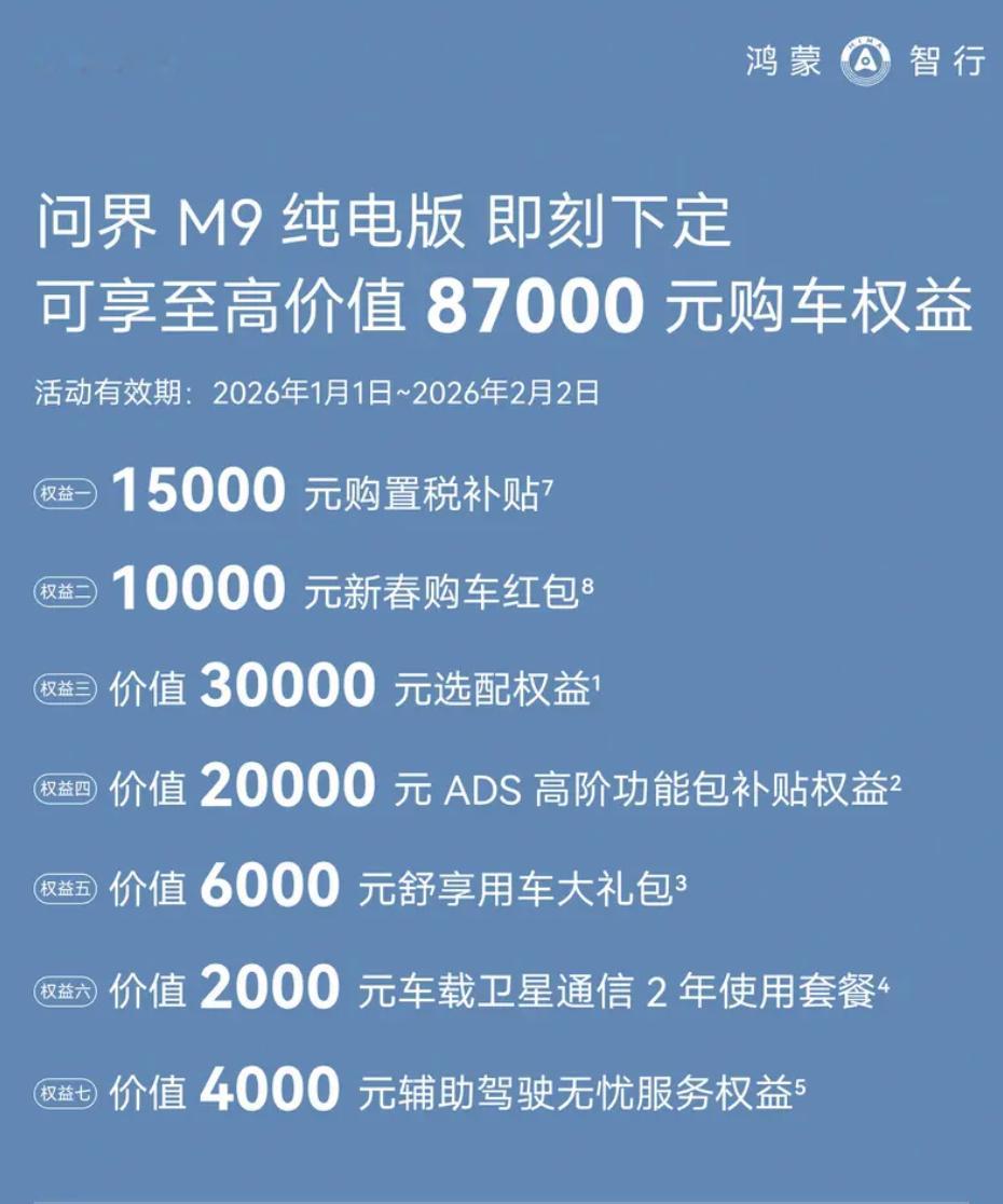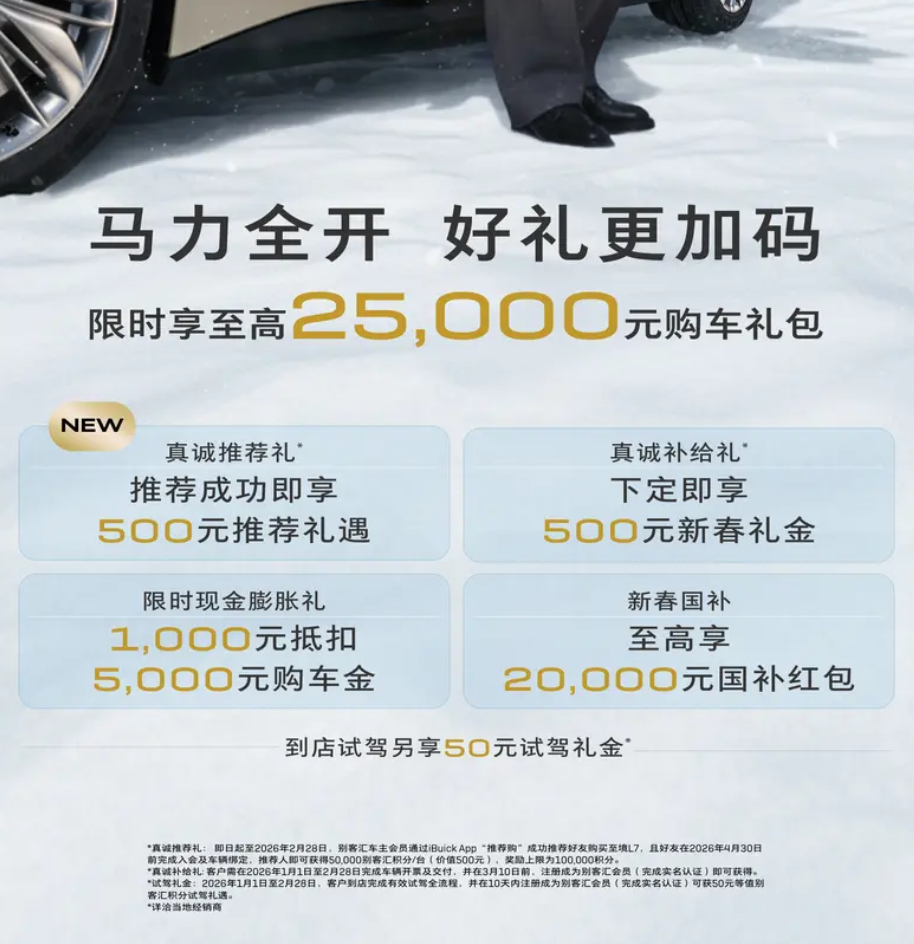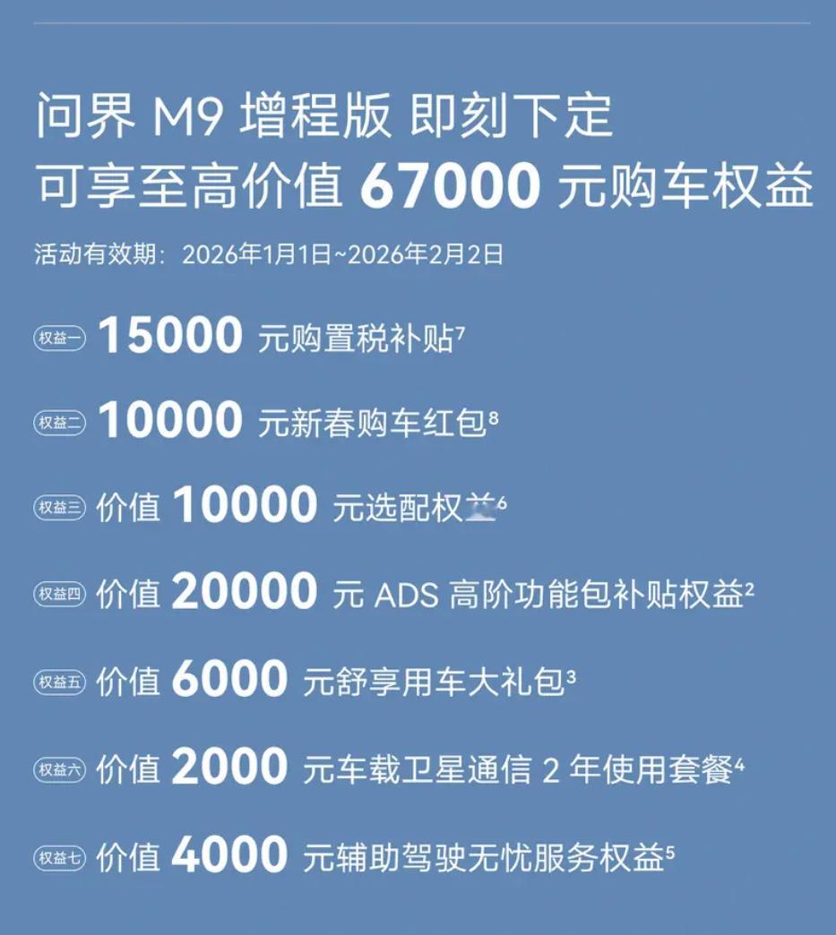 新春购车不踩雷,给大家来一波最近的车企的购车活动,看福利有没有打到您的心坎里。-理想推7年超低月供购车方案,首付3.25万元起,月供最低2578元,理想MEGA、理想i8有专属7年贷款方案,购车压力更小,7年满满还呗。-深蓝汽车购置税限时补,至高1万元,还有换购礼和新春国补+5年0息,每台车的力度不一样,相信您得咨询咨询经销商,看看活动海报。-别克至境L7推出新春限时礼遇,限时至高2.5万购车礼包,时间限制到2月28日前,给了大家充足的考虑时间,到店试驾有50元礼金。-2月2日前,买问界M9纯电送至高8.7万购车权益,买问界M9增程送至高6.7万购车权益,详细送的东西,便宜了哪些,给大家上图了,这力度应该是目前最大的了。车若初见