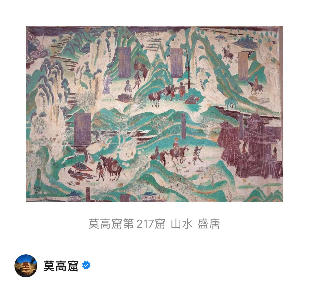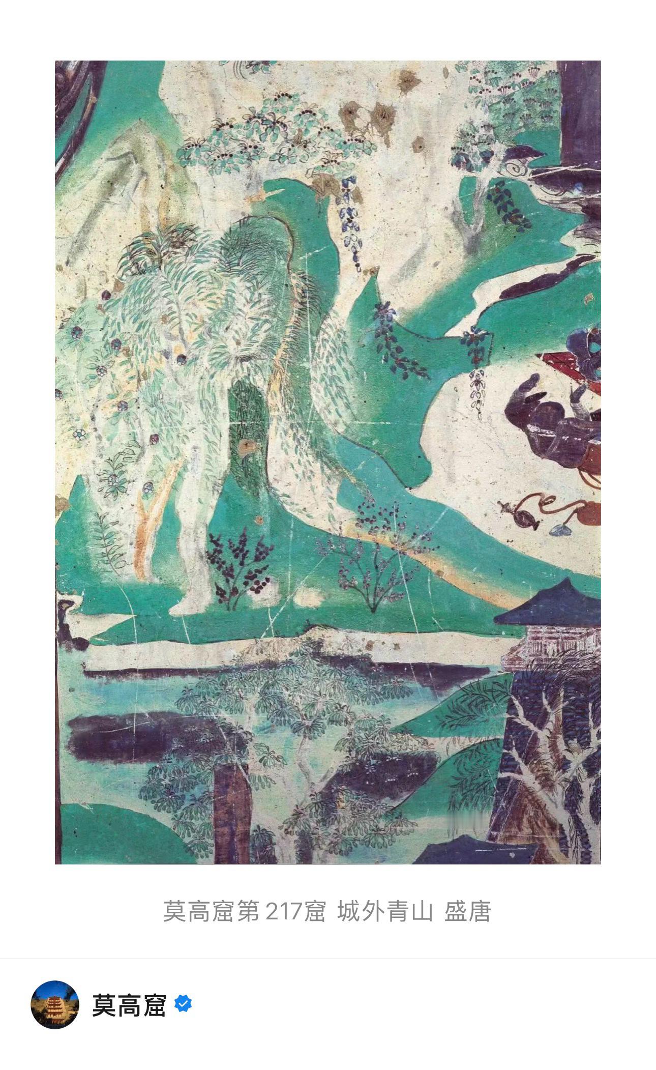 【 敦煌说丨寻踪青绿山水里的盛唐春光 】 (莫高窟 2025年12月9日 12:33 ) 走进莫高窟第217窟,一幅千年前的青绿山水画卷正在洞窟南壁徐徐展开。 这幅绘制于盛唐的山水画,以青山绿水为幕布,讲述印度僧人佛陀波利远赴五台山,偶遇文殊菩萨化现老人,之后携经再上五台山的传奇故事。画面中青山叠嶂,流水蜿蜒,旅人策马徐行,宛如盛唐春日的绮丽山水定格在了壁面之上。 画面从右上耸立的危崖开始,有两人一远一近骑马踏春,远处河流如丝带蜿蜒。中部双峰夹峙,飞瀑如练跌落,山下旅人驻马观赏。左下部河畔边,三人或躺卧,或牵马,或在水边欲饮山泉。右下部,旅人向一座西域风格的城堡走去,近旁桃李灼灼,春意盎然。 画师以细腻的笔触,巧妙调度山水要素——远景河流细如游丝,近景波浪翻滚有声,山崖间泉水叮咚,树木则松柳掩映、桃李争妍,从悬崖到山丘,从荒野到城郭,各得其宜,交织成一幅“可居可游”的山水行旅图。 这便是画史记载的“青绿山水”画,青绿山水,以石青、石绿为主色,始于六朝,兴盛于唐代,李思训、李昭道父子为其代表画家,其画作往往笔格遒劲,金碧辉映,自成一家。莫高窟第217窟开凿时间大致在盛唐时期,自然受其风格影响。 千年之后,在石绿的清透与石青的深邃间,我们能望见的不仅是流淌的山水灵气,更是唐代人对自然的审美与热爱。 网页链接