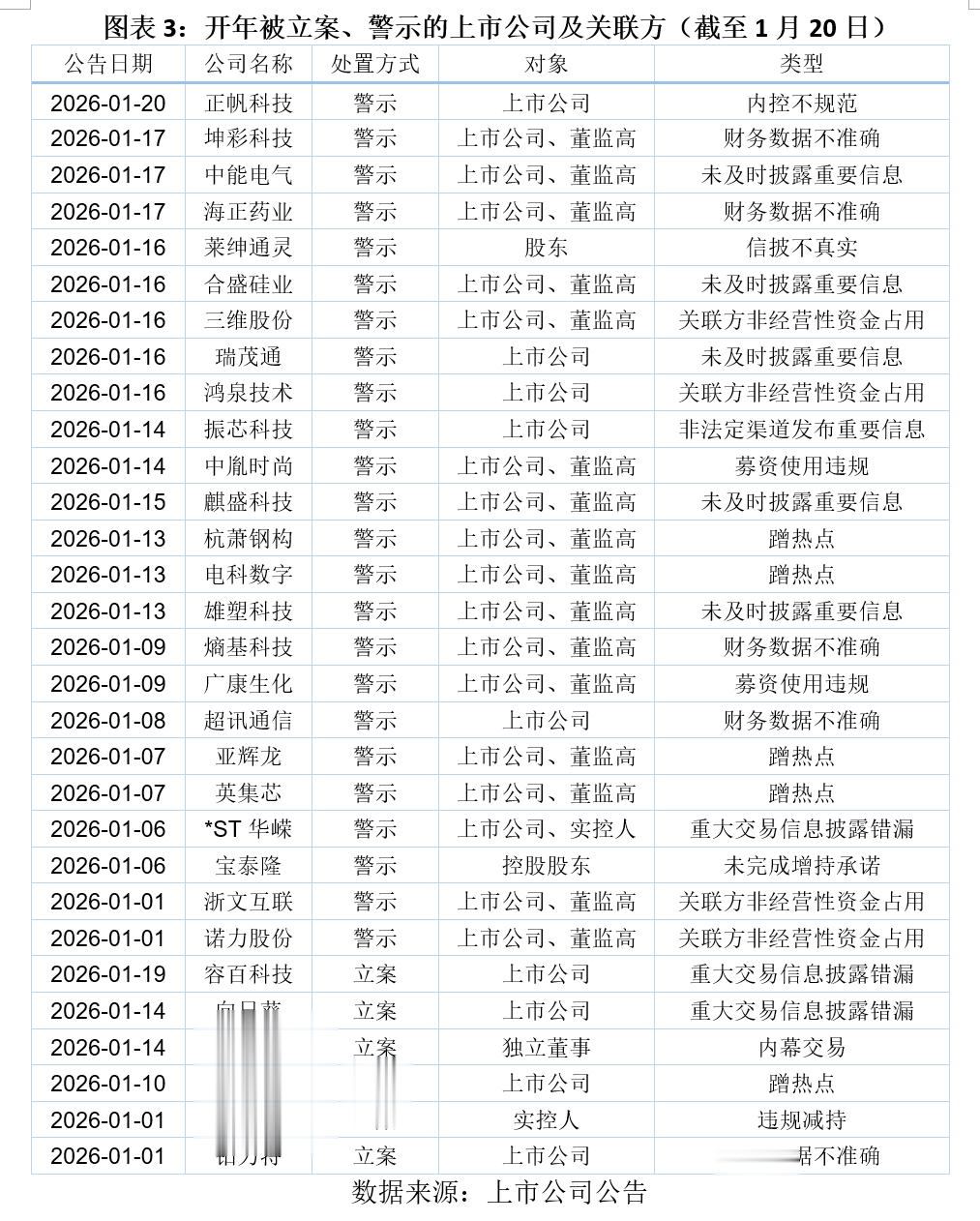 今年以来,资本市场监管力度持续加码,上市公司及关联方违规行为受到精准打击。截至1月20日,已有30家上市公司/关联方被监管部门采取“警示”或“立案”措施,其中24家被警示、6家被立案。