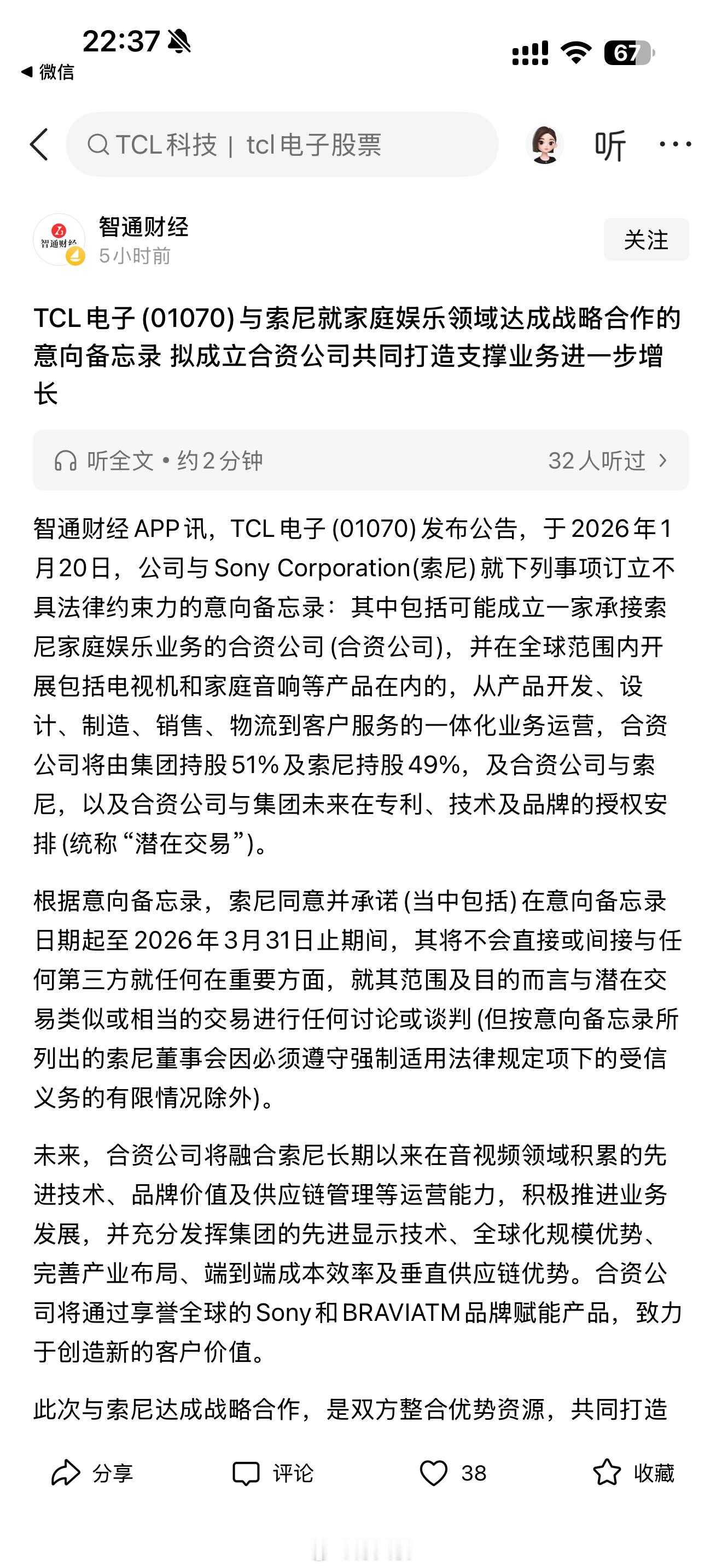 18、19 年去品川参观索尼总部, 20 年受索尼邀请参加 CES,当时的展会赞助商是 TCL。20 年的下半年我也加入了 TCL。今天看到这条新闻,两家和我很有缘的厂商强强联手,心里百感交集