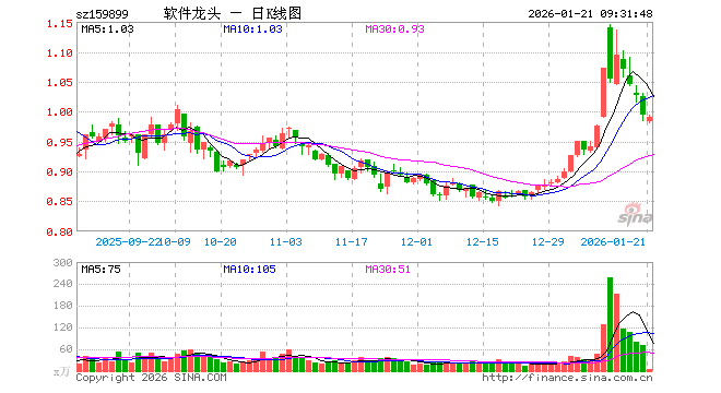 1月21日,软件龙头ETF(159899)开盘跌1.11%,报0.984元。软件龙头ETF(159899)重仓股方面,科大讯飞开盘跌1.02%,同花顺涨1.44%,金山办公跌0.30%,指南针跌0.35%,恒生电子跌0.62%,润和软件跌0.83%,三六零跌0.81%,拓维信息跌0.78%,用友网络跌0.99%。