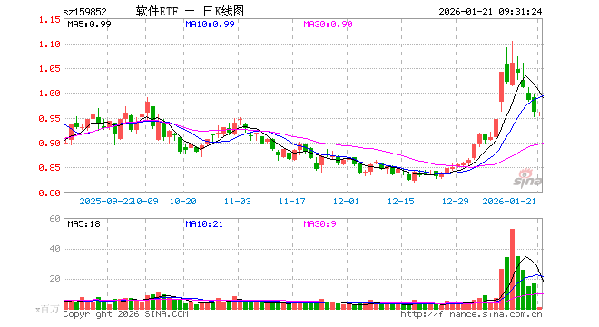 1月21日,软件ETF(159852)开盘跌0.52%,报0.956元。软件ETF(159852)重仓股方面,科大讯飞开盘跌1.02%,同花顺涨1.44%,金山办公跌0.30%,指南针跌0.35%,恒生电子跌0.62%,润和软件跌0.83%,三六零跌0.81%,拓维信息跌0.78%,用友网络跌0.99%。