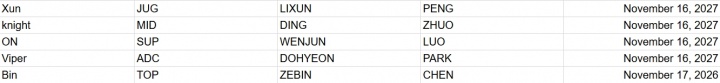 直播吧1月21日讯 随着LPL赛事的进行赛事官方也逐渐开始更新本赛季各支战队选手的合同情况,根据合同数据库网站显示,BLG首发五人中仅Bin选手合同今年到期,Xun、knight、ON以及Viper的合同签约到2027年。