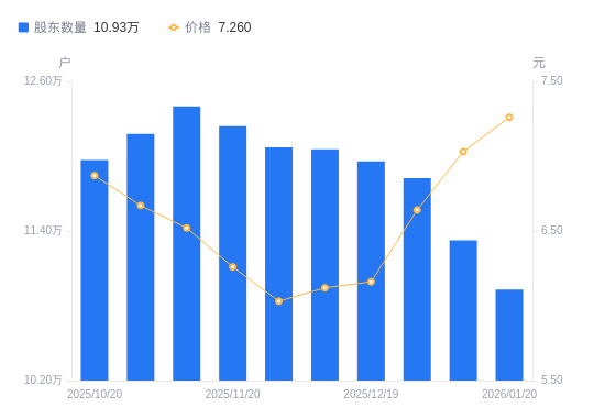 日期A股户数(户)流通A股户均持股数(股)户均持股市值(万元)2026-01-2010930518079.3913.132026-01-0911324517450.3712.272025-12-3111822516715.3111.102025-12-1911957216527.0110.182025-12-1012054616393.1210.032025-11-2812070916370.999.872025-11-2012240416144.2910.112025-11-1012400015936.5010.392025-10-3112178316226.6110.822025-10-2011970016508.9911.34
