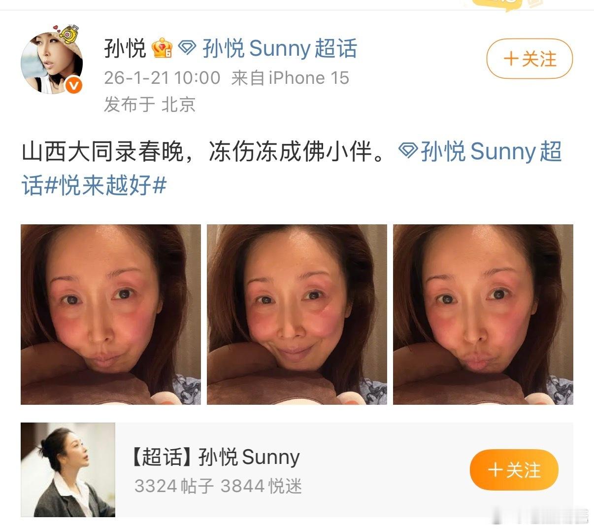 孙悦录春晚脸被冻伤 孙悦姐姐真的太敬业了,脸被冻伤还坚持工作。希望她能好好休息,也祝录制顺利。