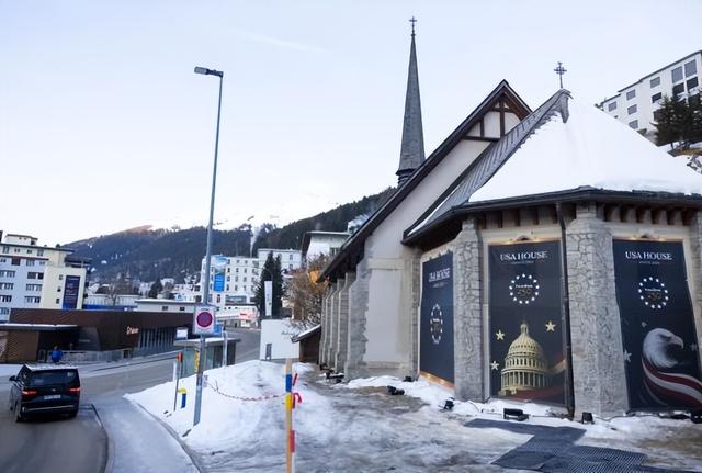 论坛期间,美国代表团入驻一座建于19世纪末的教堂,这座教堂现已被改造成会议场地“美国之家”(USAHouse),外墙悬挂着庆祝美国建国250周年的纪念徽章与标识。
