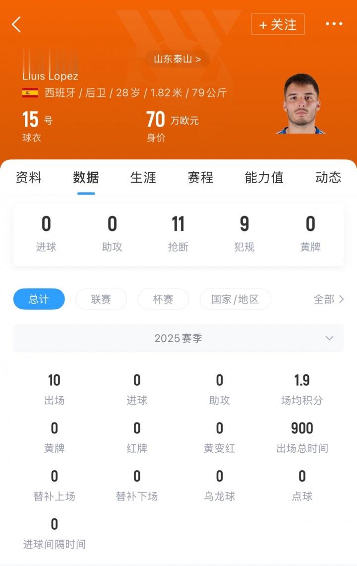 洛佩斯现年28岁,去年夏天加盟山东泰山,上赛季为球队总计出场10次。目前德转身价70万欧元。