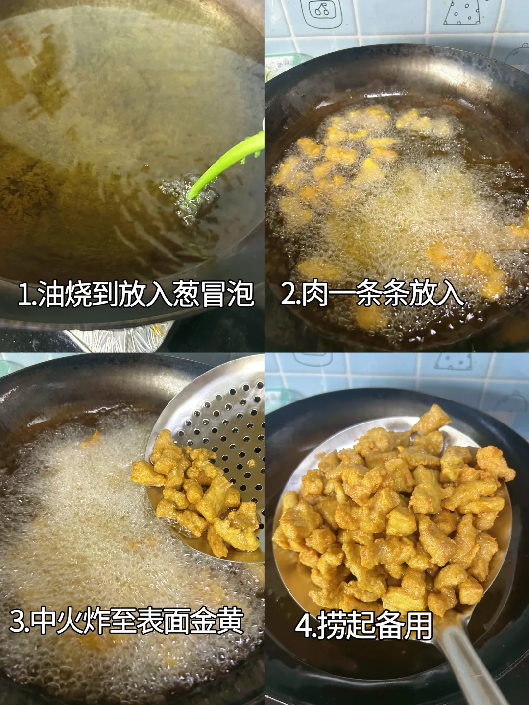 4.油烧到放入一截小葱马上冒泡,一条条地放入里脊肉,中火炸至漂起,外表金黄酥脆。如果量比较多,先放一半,炸至定型后捞起来,等两份都炸好后,再次放入锅里复炸十秒。捞起来备用。