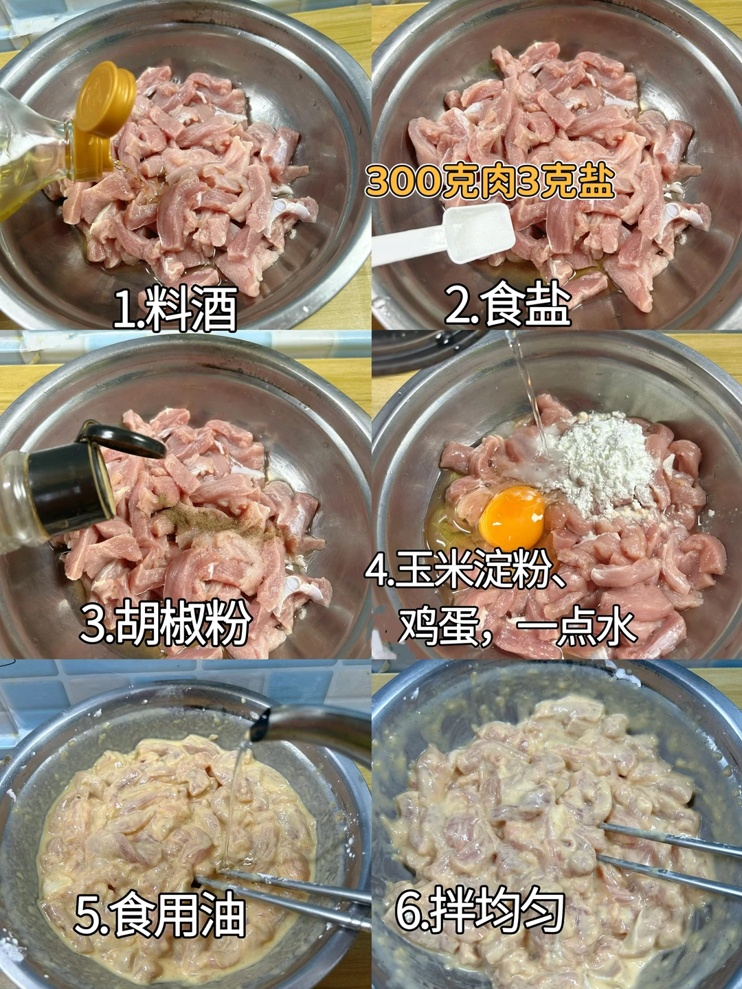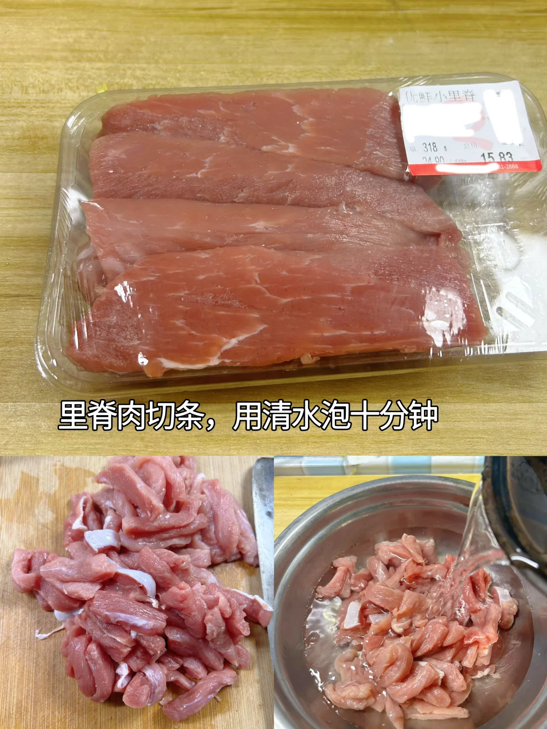 1.里脊肉切条,冲洗几遍,用水泡10分钟,攥干水分。