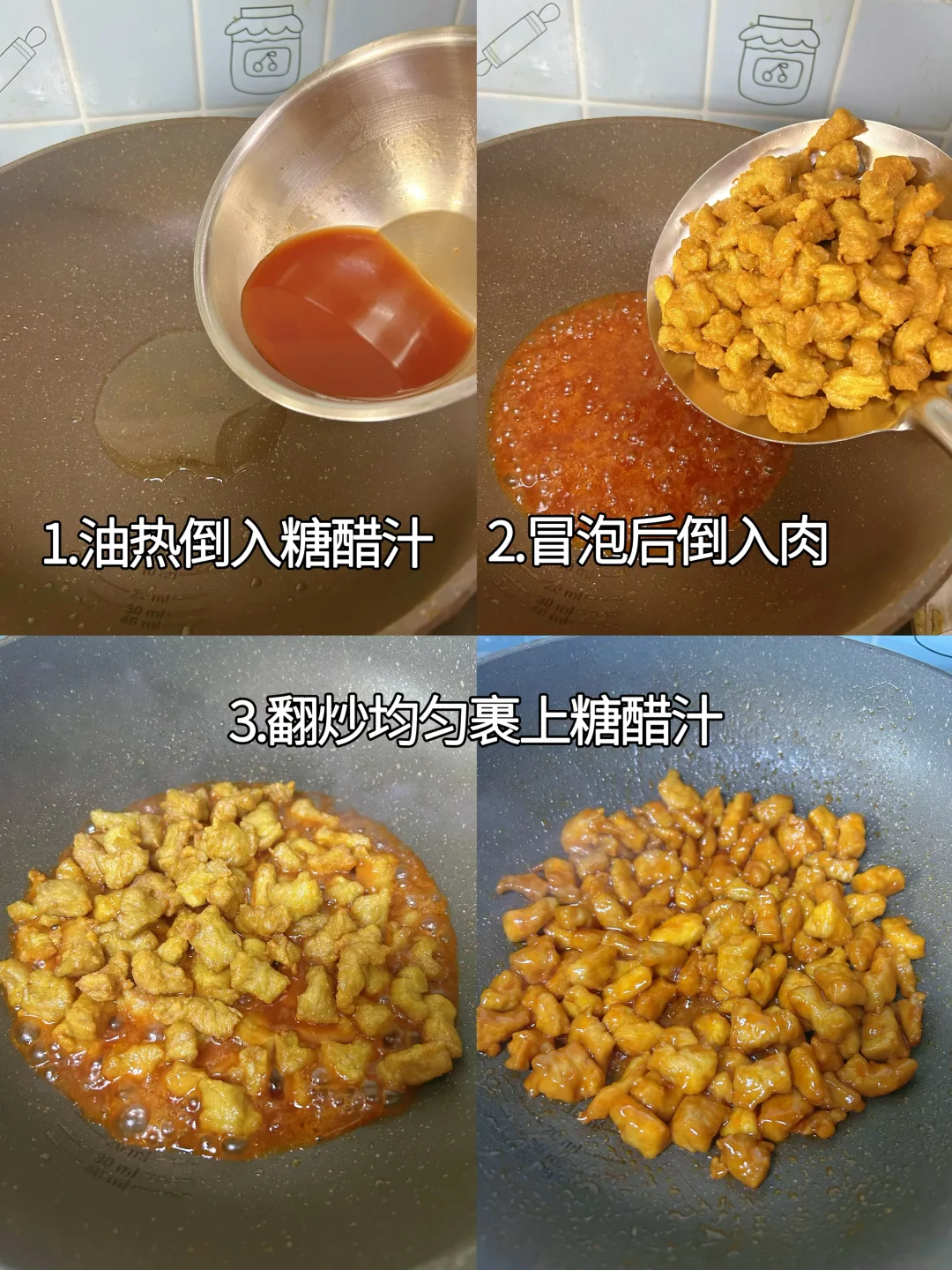 5.另起锅放少许油,倒入糖醋汁,用锅铲搅拌至冒密集小泡后倒入里脊肉。翻炒十秒到均匀裹上糖醋汁。